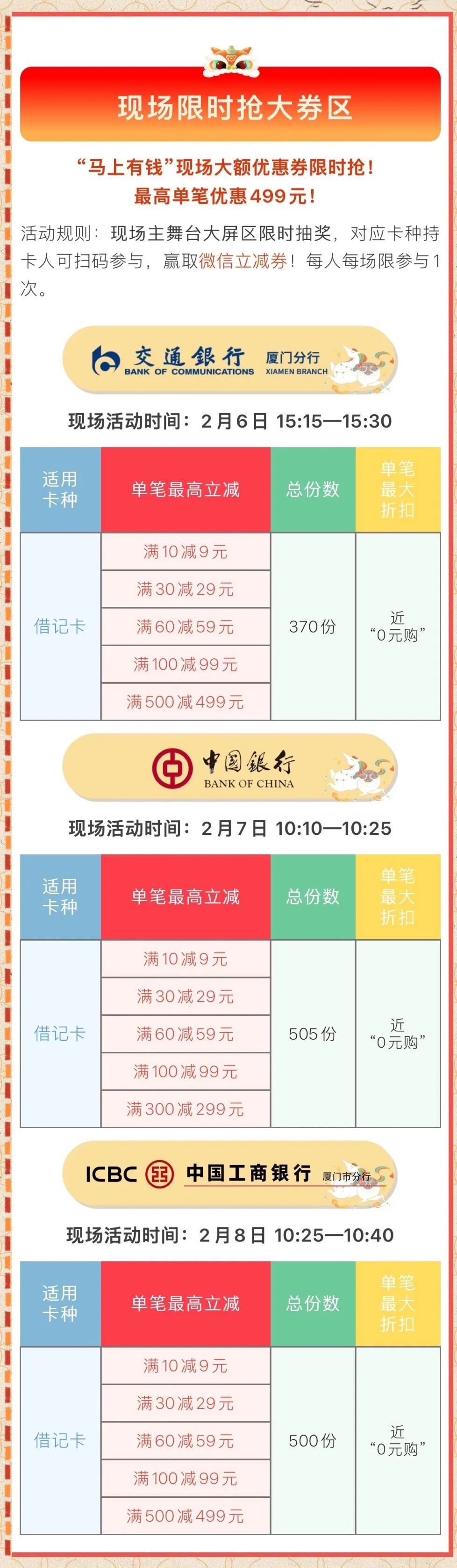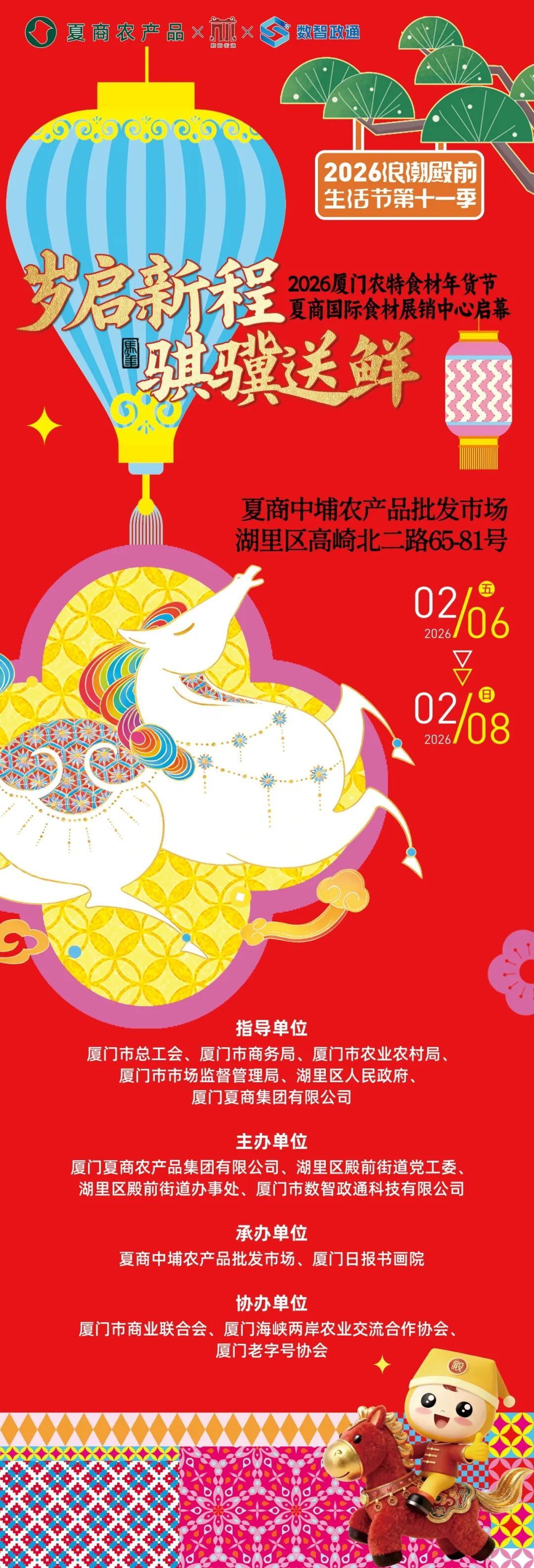 “2026厦门农特食材年货节” 暨浪潮殿前生活节 本周五,正式启幕! 连续两届火爆鹭岛 数万市民打卡的年味大集 今年更有新升级 展商摊位更优质 商品种类更丰富 优惠补贴更多样 年味活动更多彩 …… 夏商农产品集团重磅打造的 夏商(中埔)国际食材展销中心(A区) 也将首次亮相! 逛吃买玩一站式搞定 还能薅百万补贴羊毛 2026厦门农特食材年货节由厦门夏商农产品集团有限公司、湖里区殿前街道党工委、湖里区殿前街道办事处、厦门市数智政通科技有限公司共同主办,同时也是“浪潮殿前生活节”第十一季活动。 活动时间 年货节将连续举办三天 2月6日—8日 每天9:00—17:00 夏商中埔农产品批发市场 地铁直达 安排接送 免费停车 近300个摊位 数千种食材近批发价 250+户外展位、50+室内展位(A/B区)实力集结,厂家直供、产地直采商户等同台亮相,数千种全球农特食材近批发价销售,一站购齐优质好货。夏商(中埔)国际食材展销中心(A 区) 同步开业、全年“不落幕” 展销。 产地直达的新鲜果蔬、肉禽海鲜,厦门老字号、高端酒店食材,山珍海味节庆礼盒……全球好货齐聚,全品类覆盖,一手货源,三天时间,以近批发价销售! 超百万补贴 N重优惠尽享折上折 夏商惠民+商家让利+银联助力+各大银行满减+中国移动福利+转盘抽奖+抖音代金券……超130万现金优惠! 单人最高可享1700元优惠(现场抽奖最多可获1297元微信立减券),开新卡还有大礼包,尽享“折上折”,单笔低至近“0元购”,所有领券、游戏、线上逛展尽在“夏商生活圈”小程序,手慢无! 体验+小吃+互动 闽南年味拉满! 逛年货节不只是买买买,更是沉浸式体验闽南文化!现场还准备了多种具有鹭岛特色年味的文化体验活动,好吃又好玩。 舞台表演:杖头木偶、高甲戏、歌仔戏、车鼓弄和广场舞展演等好戏连台。 非遗体验:捏面人、拓福、剪纸、鱼灯DIY,亲手做年味小物。 特色小吃:招治薄饼、土笋冻、白水贡糖、蒜蓉枝、贡鱿鱼,闽南古早味吃个遍。 ✨两大新春特色活动超有料✨ ▫️秤心如意:年货称重赢好礼,数字含7/9领鸡蛋、红包袋,数字重复享双份! ▫️时光邮局:10元解锁复古新年纪念照,还能定制2027年货节通行证,明年直接领百元农产品~每日限量300份,手慢无! 重磅上新 夏商国际食材展销中心亮相 夏商(中埔)国际食材展销中心(A区)启幕! 依托夏商深耕农产品供应全产业链的“一手好货”资源优势,500多平方米展厅优选市场头部优质经营户及上游源头厂家入驻,覆盖全品类的优质食材,国家地理标志产品、每日直供时令特菜、本地热鲜工艺精制牛肉、品质上乘的名特优品、全网比价的实惠高端食材、独家优选的一村一品农特等,抖音平台还能30元抢购50元夏商(中埔)国际食材展销中心抵用券,立省20元,闭眼冲! 免费接驳+免费停车 轻松逛集超方便 殿前街道贴心安排殿小二免费接驳车,地铁高崎站直达市集,公交+地铁换乘超便捷!