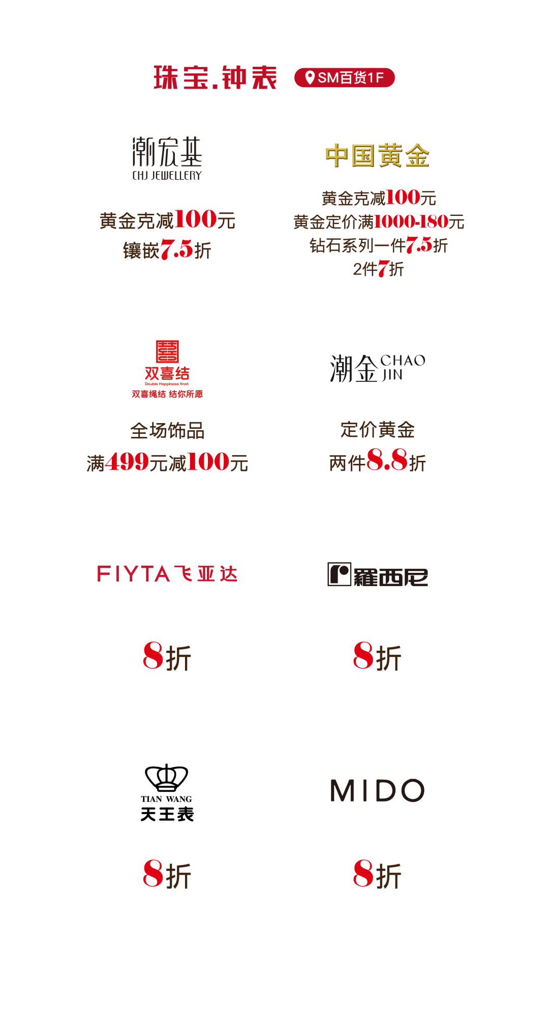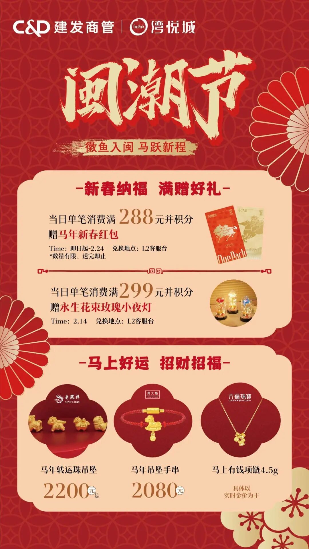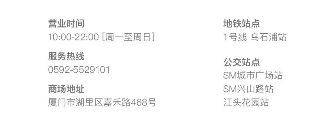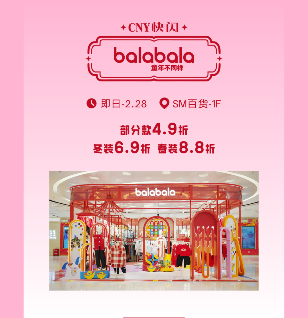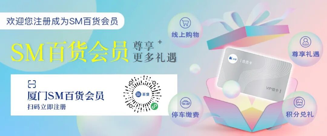 更多活动详情 请关注SM百货官方服务号 06厦门建发湾悦城 消费满额赠福袋 即日起至2月24日 在厦门建发湾悦城消费并积分 满288元即可获赠新春福袋 把年味和好运一起带回家 闽潮节 3月1日/3月3日 闽潮节「徽鱼入闽 马跃新程」精彩启幕 8米徽州鱼灯点亮元宵夜 非遗饶平布马舞带来吉祥祝福 更有非遗民俗游园会 猜灯谜、花灯巡游等丰富体验 让传统年味触手可及 07航空古地石广场 宵宵乐音乐会 时间:2月27日/ 3月3日/ 3月6日 19:30-21:00 地点:航空古地石广场B区G层下沉广场 猜灯谜赢好礼 汉服NPC互动猜灯谜 时间:3月3日19:30-21:30 地点:航空古地石广场全区 下滑查看具体活动内容 08厦门鹭港 厦门鹭港新春福利加码啦! 2月15日—2月23日 厦门鹭港地下停车场 免费停车4小时 (每日首次进场停车可享) 2月17日至3月3日 凭厦门鹭港万达影城票根进店消费 即可解锁专属福利 观影购物双重惊喜! 下滑查看具体活动内容