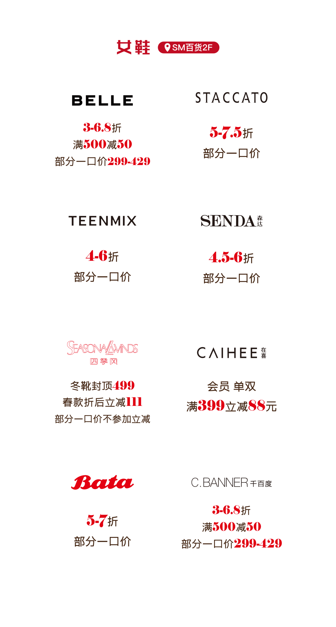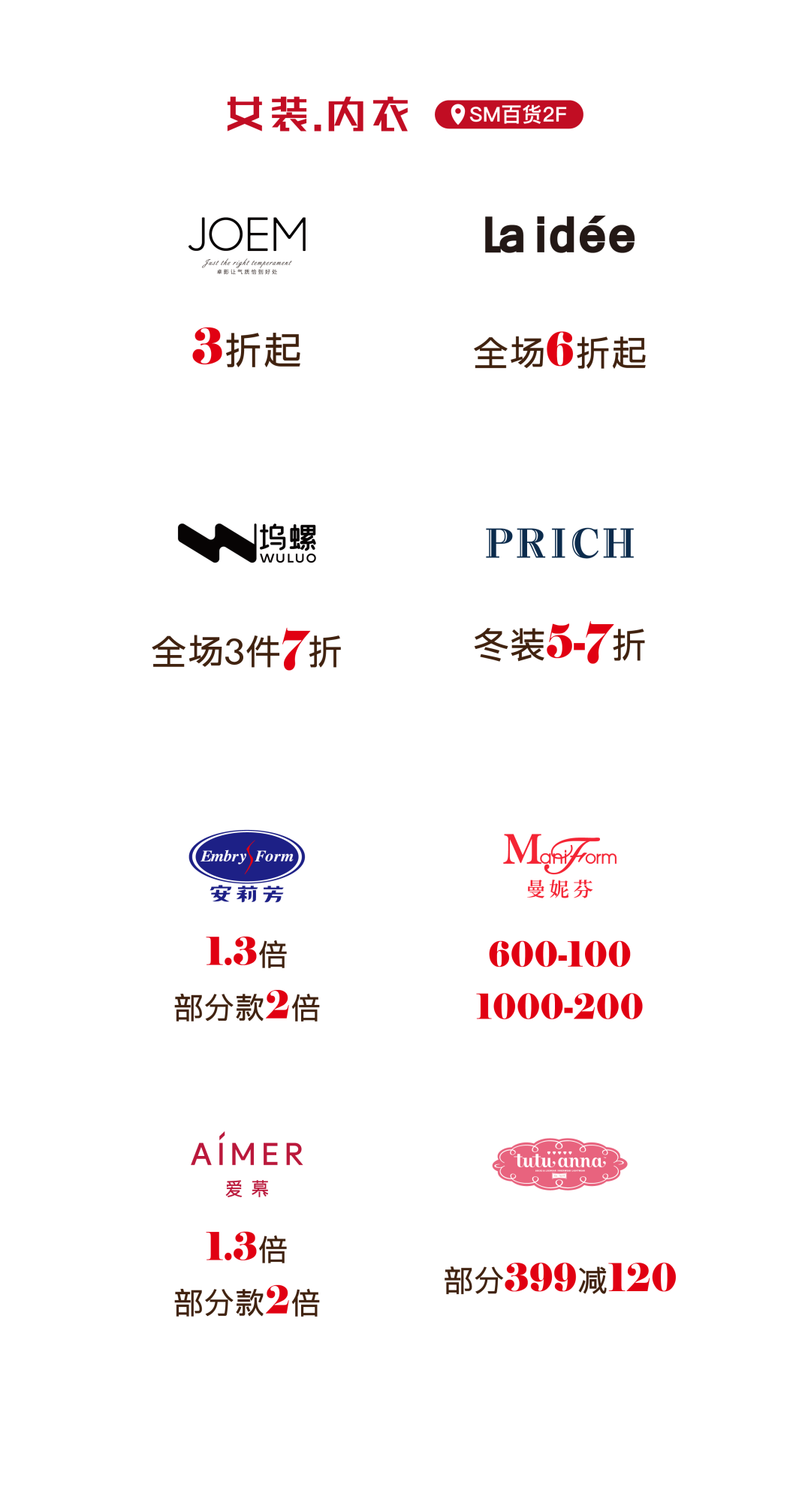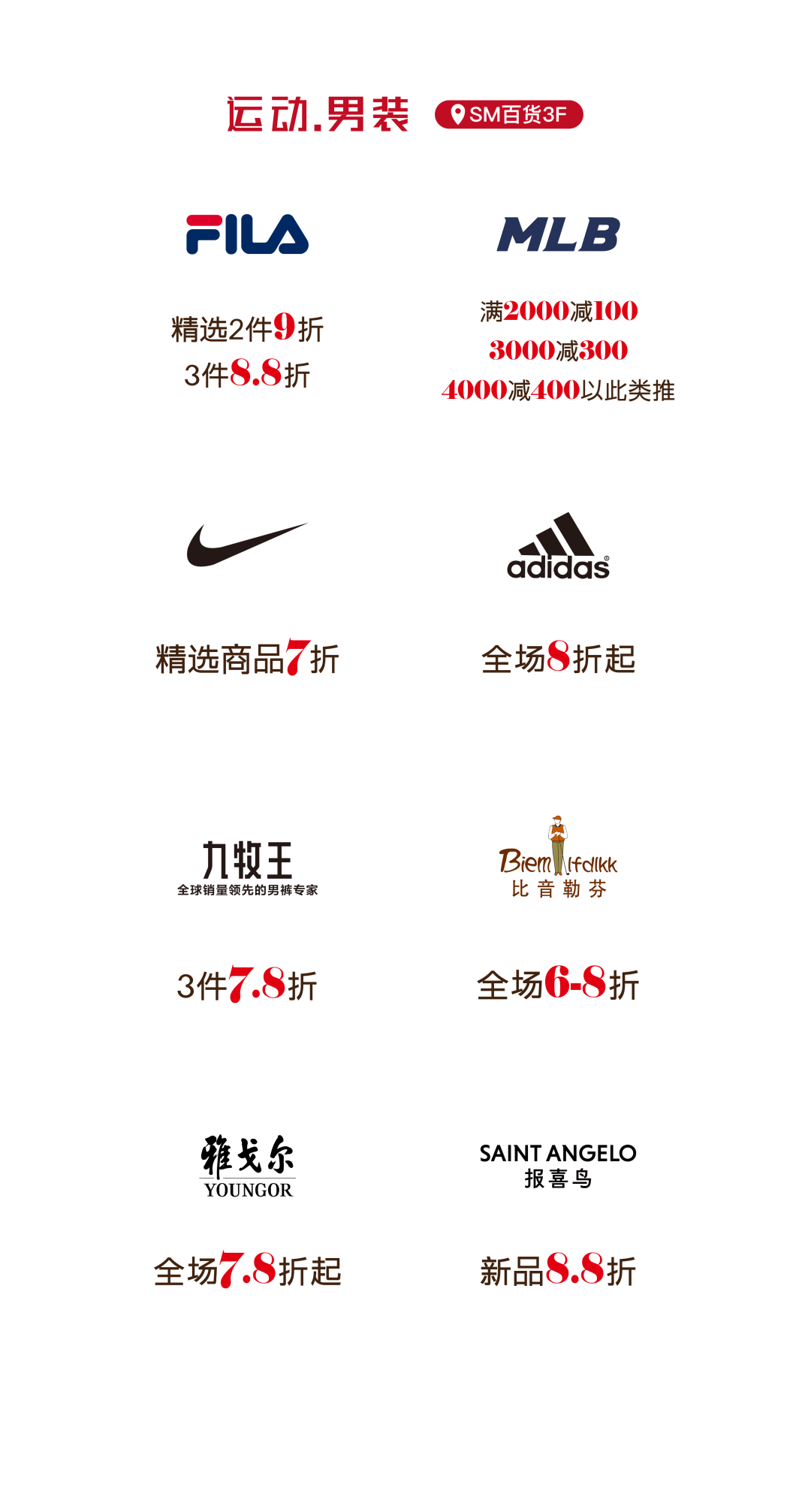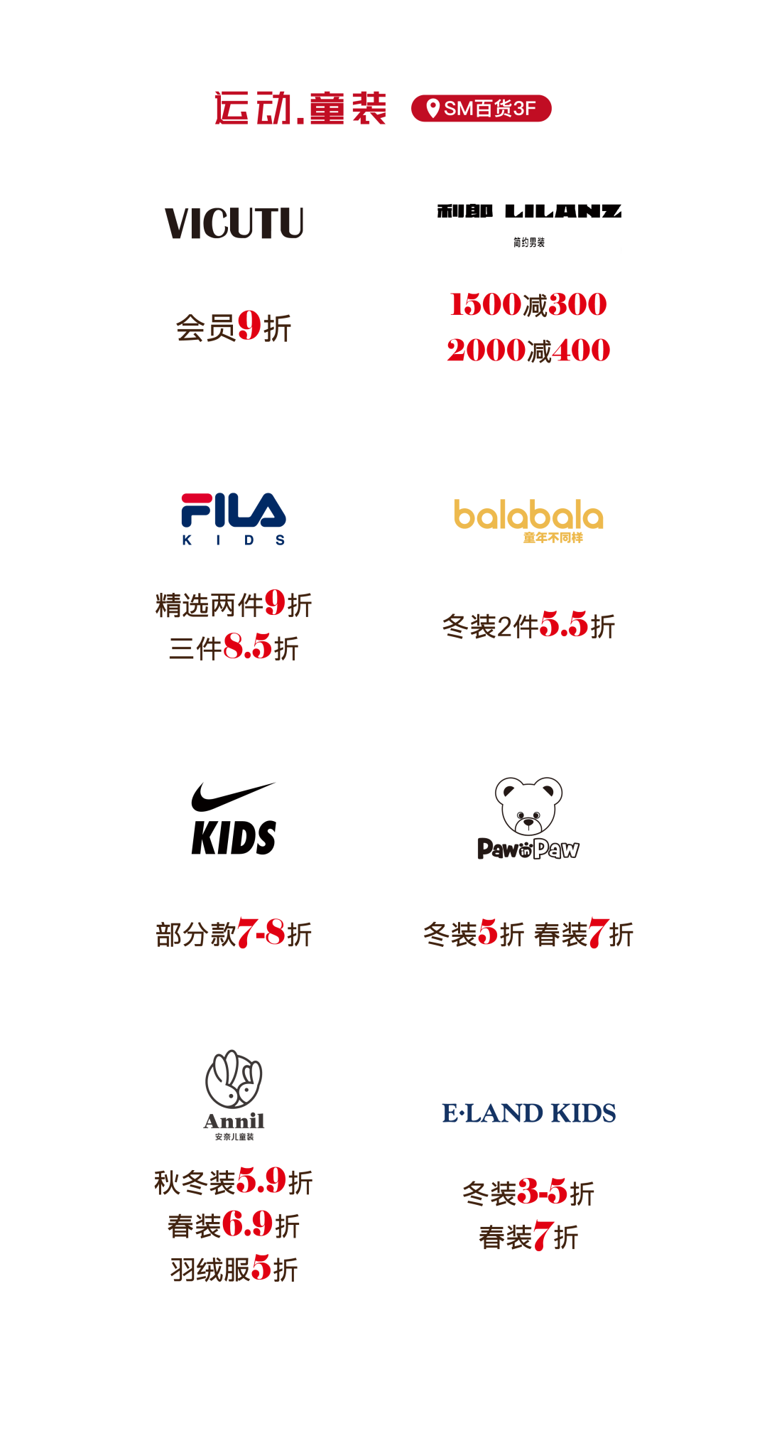 更多活动详情 请关注SM百货官方服务号 06厦门建发湾悦城 消费满额赠福袋 即日起至2月24日 在厦门建发湾悦城消费并积分 满288元即可获赠新春福袋 把年味和好运一起带回家 闽潮节 3月1日/3月3日 闽潮节「徽鱼入闽 马跃新程」精彩启幕 8米徽州鱼灯点亮元宵夜 非遗饶平布马舞带来吉祥祝福 更有非遗民俗游园会 猜灯谜、花灯巡游等丰富体验 让传统年味触手可及 07航空古地石广场 宵宵乐音乐会 时间:2月27日/ 3月3日/ 3月6日 19:30-21:00 地点:航空古地石广场B区G层下沉广场 猜灯谜赢好礼 汉服NPC互动猜灯谜 时间:3月3日19:30-21:30 地点:航空古地石广场全区 下滑查看具体活动内容 08厦门鹭港 厦门鹭港新春福利加码啦! 2月15日—2月23日 厦门鹭港地下停车场 免费停车4小时 (每日首次进场停车可享) 2月17日至3月3日 凭厦门鹭港万达影城票根进店消费 即可解锁专属福利 观影购物双重惊喜! 下滑查看具体活动内容