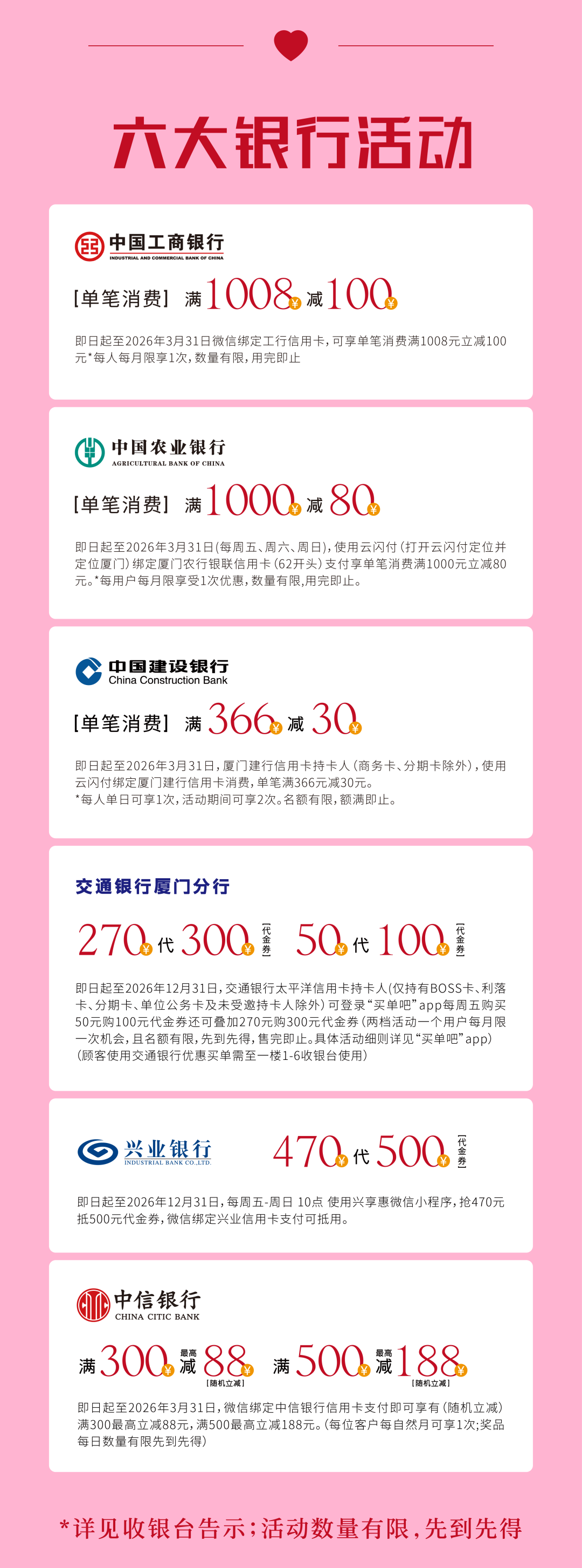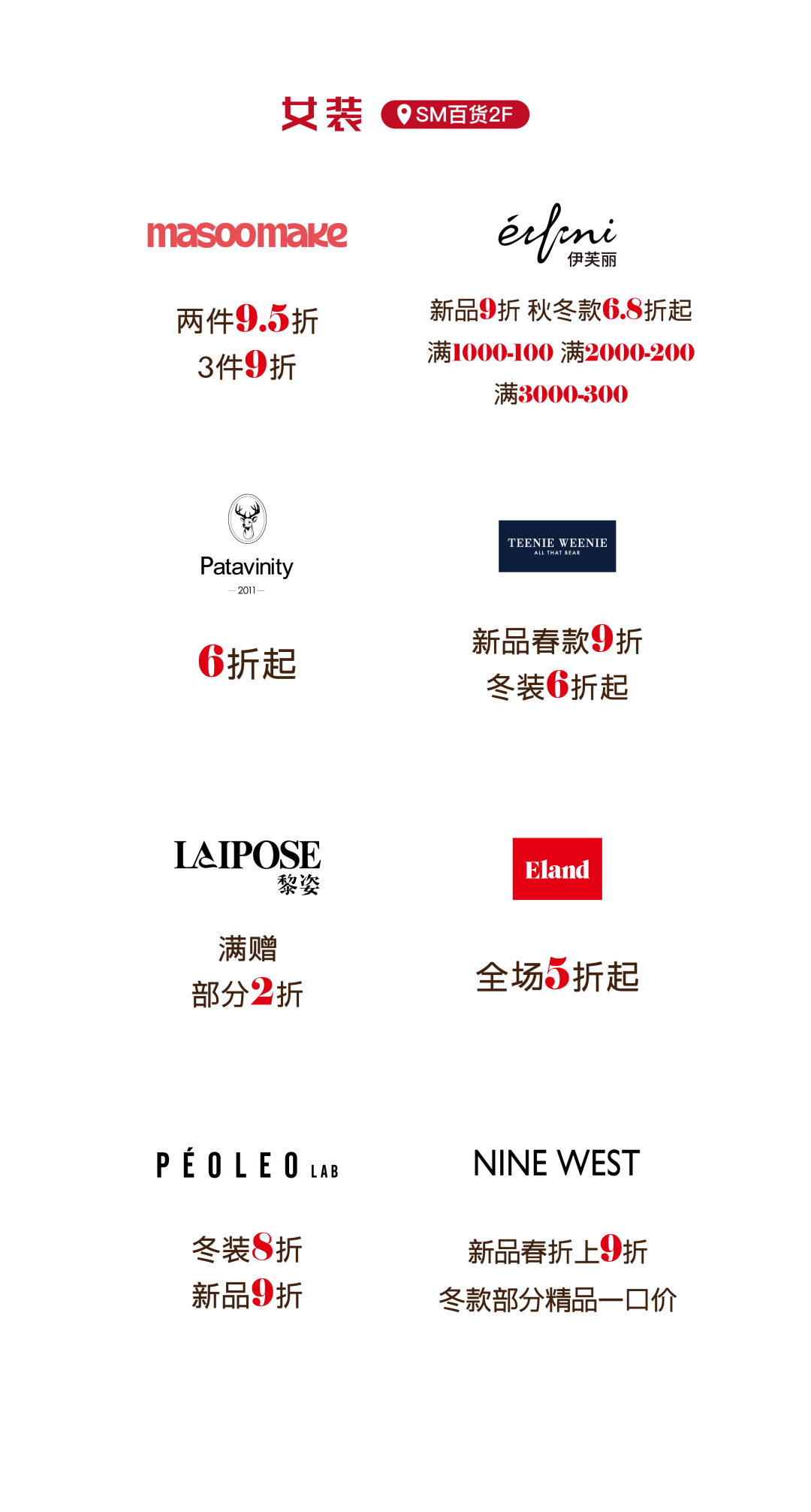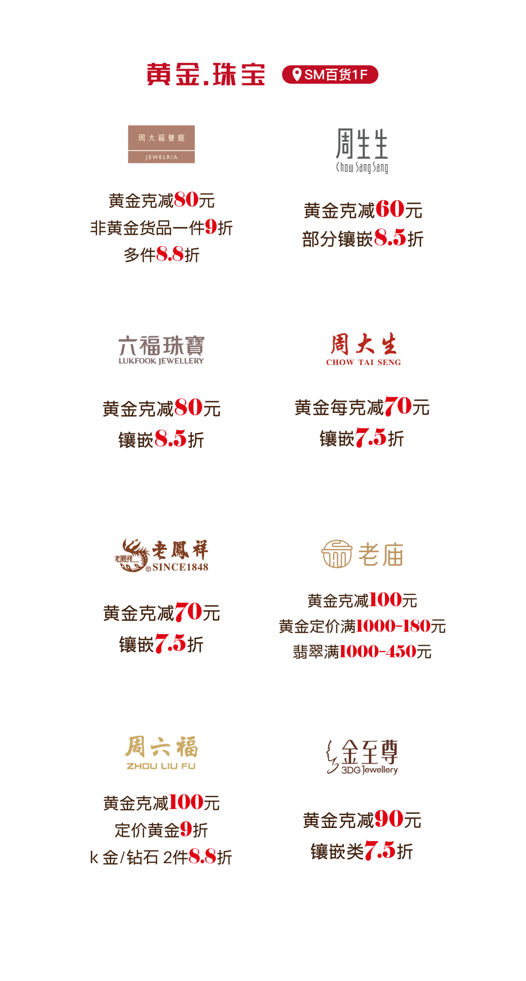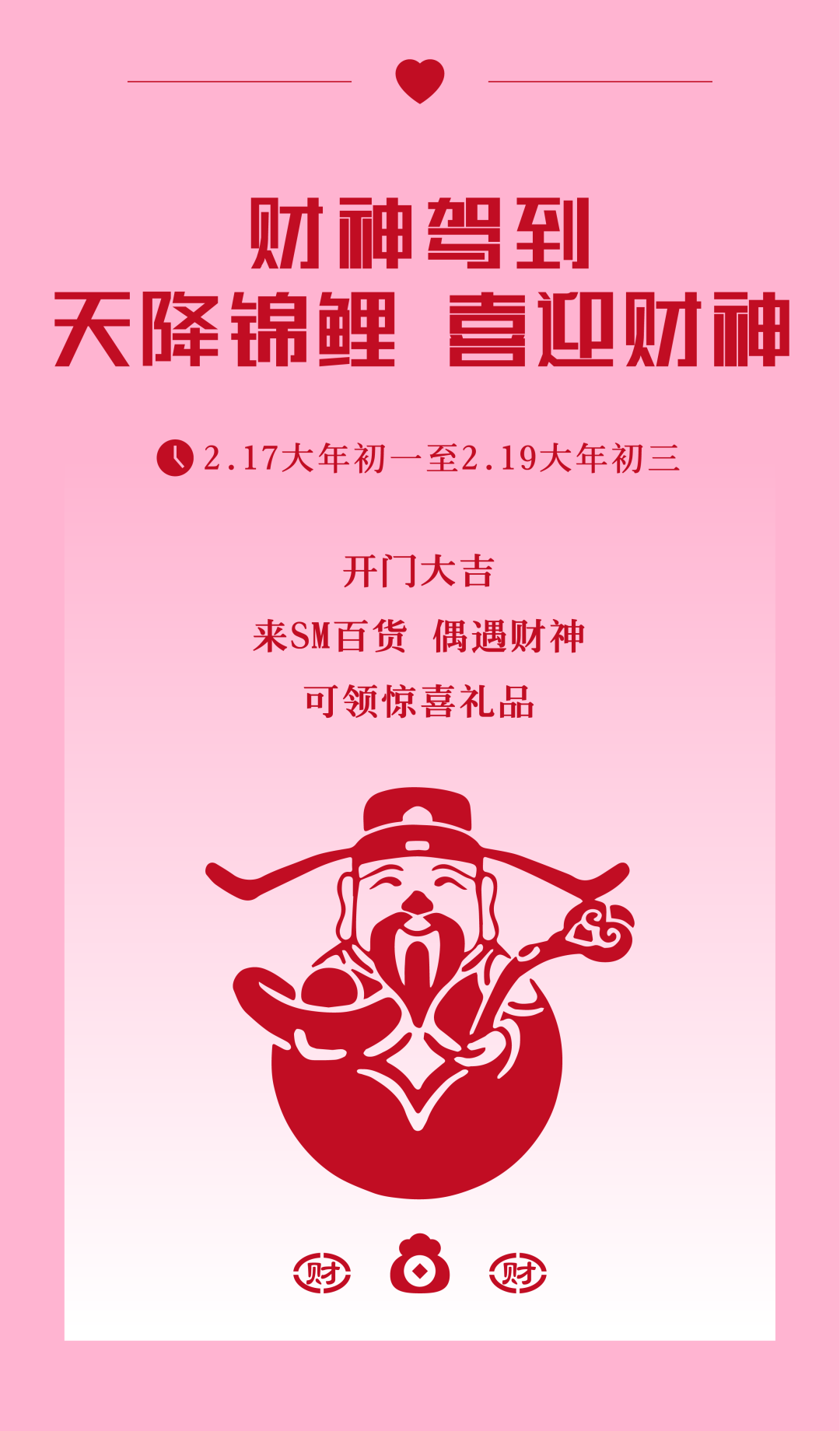 更多活动详情 请关注SM百货官方服务号 06厦门建发湾悦城 消费满额赠福袋 即日起至2月24日 在厦门建发湾悦城消费并积分 满288元即可获赠新春福袋 把年味和好运一起带回家 闽潮节 3月1日/3月3日 闽潮节「徽鱼入闽 马跃新程」精彩启幕 8米徽州鱼灯点亮元宵夜 非遗饶平布马舞带来吉祥祝福 更有非遗民俗游园会 猜灯谜、花灯巡游等丰富体验 让传统年味触手可及 07航空古地石广场 宵宵乐音乐会 时间:2月27日/ 3月3日/ 3月6日 19:30-21:00 地点:航空古地石广场B区G层下沉广场 猜灯谜赢好礼 汉服NPC互动猜灯谜 时间:3月3日19:30-21:30 地点:航空古地石广场全区 下滑查看具体活动内容 08厦门鹭港 厦门鹭港新春福利加码啦! 2月15日—2月23日 厦门鹭港地下停车场 免费停车4小时 (每日首次进场停车可享) 2月17日至3月3日 凭厦门鹭港万达影城票根进店消费 即可解锁专属福利 观影购物双重惊喜! 下滑查看具体活动内容
