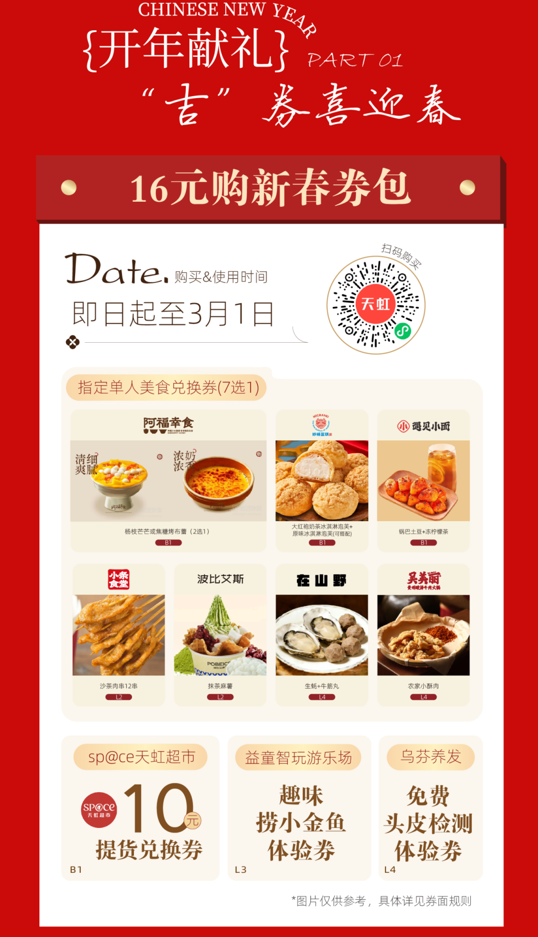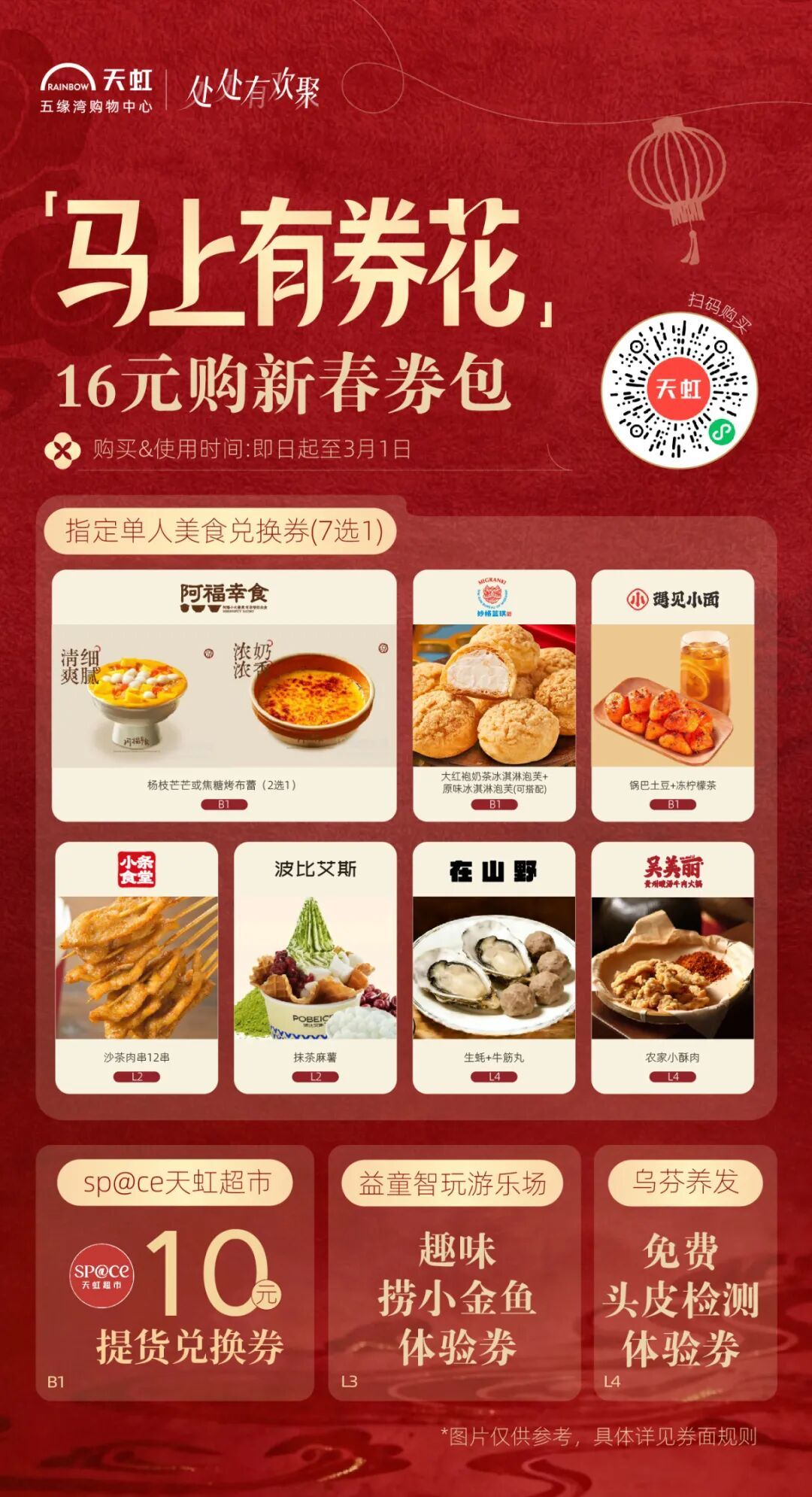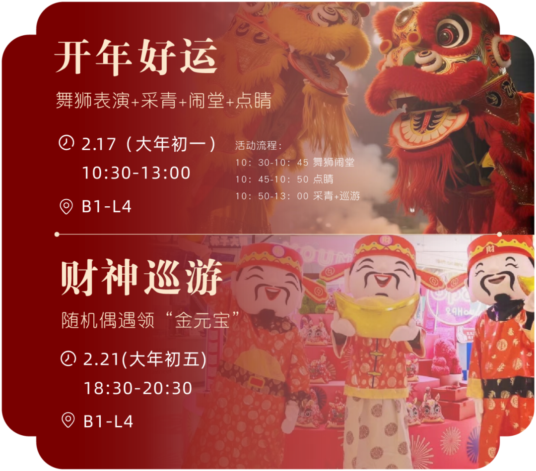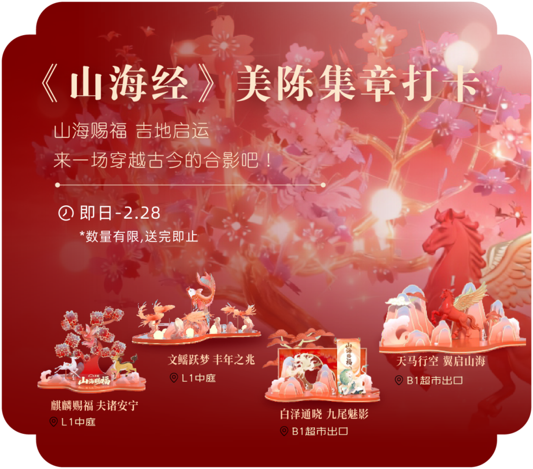 02五缘湾天虹购物中心 16元马上有券春节券包 火热开抢! 指定单人美食兑换券(7选1) sp@ce 天虹超市10元提货兑换券 益童智玩游乐场趣味捞小金鱼体验券 乌芬养发免费头皮检测体验券 一券解锁多重快乐! 即日起至2月28日 「山海聚灵」山海经主题美陈惊艳亮相 四大打卡点位等你来解锁! 2月14日限时大秀浪漫登场 大年初一开年好运 舞狮、采青、闹堂、点睛热闹启幕 大年初五财神巡游送福来 2月18日 —2月24日 丁程鑫生日应援痛楼惊喜上线 2月28日元宵游园会欢乐延续 多重精彩活动轮番上演 等你来赴这场热闹之约! 01 02 03 04 05 左右滑动查看更多>>> 下滑查看具体活动内容