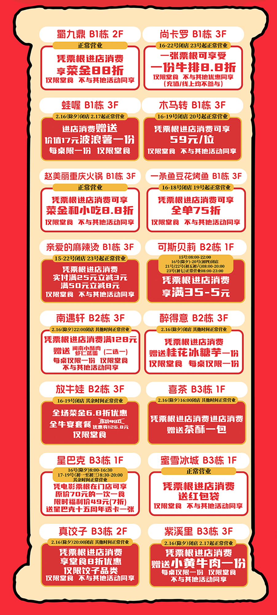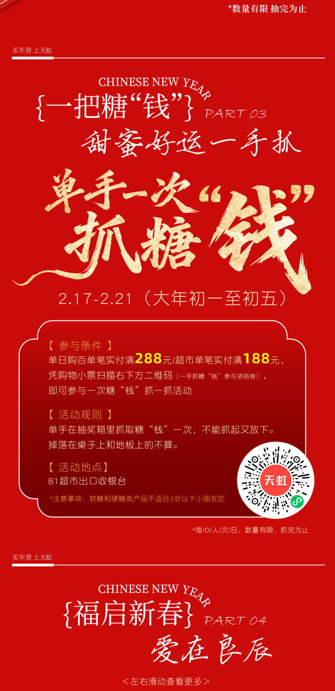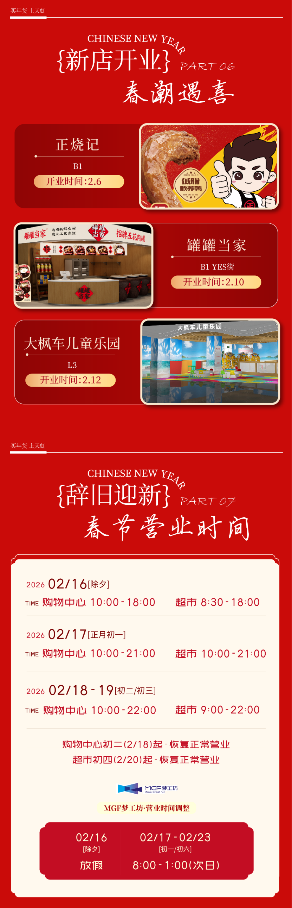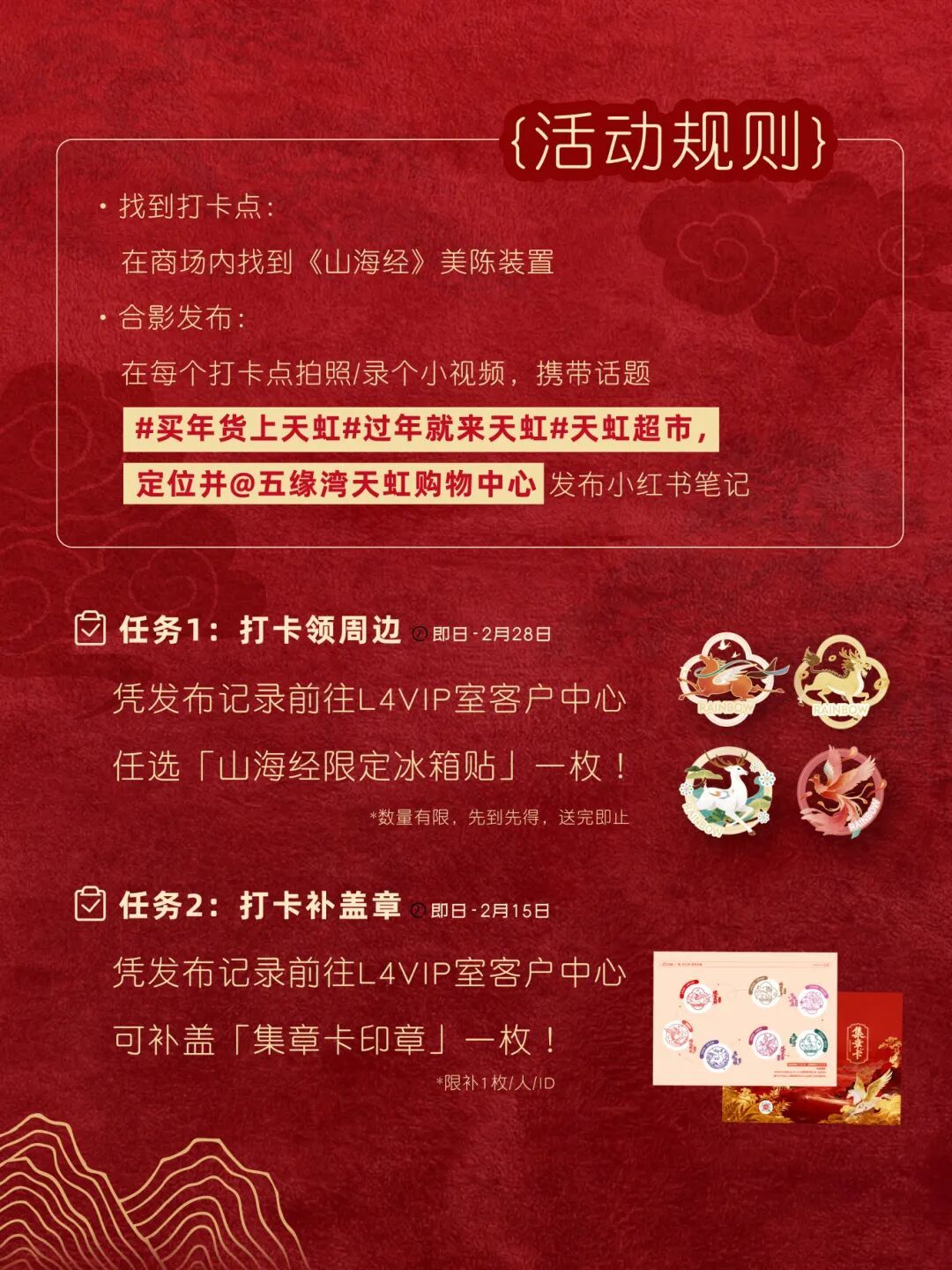 02五缘湾天虹购物中心 16元马上有券春节券包 火热开抢! 指定单人美食兑换券(7选1) sp@ce 天虹超市10元提货兑换券 益童智玩游乐场趣味捞小金鱼体验券 乌芬养发免费头皮检测体验券 一券解锁多重快乐! 即日起至2月28日 「山海聚灵」山海经主题美陈惊艳亮相 四大打卡点位等你来解锁! 2月14日限时大秀浪漫登场 大年初一开年好运 舞狮、采青、闹堂、点睛热闹启幕 大年初五财神巡游送福来 2月18日 —2月24日 丁程鑫生日应援痛楼惊喜上线 2月28日元宵游园会欢乐延续 多重精彩活动轮番上演 等你来赴这场热闹之约! 01 02 03 04 05 左右滑动查看更多>>> 下滑查看具体活动内容