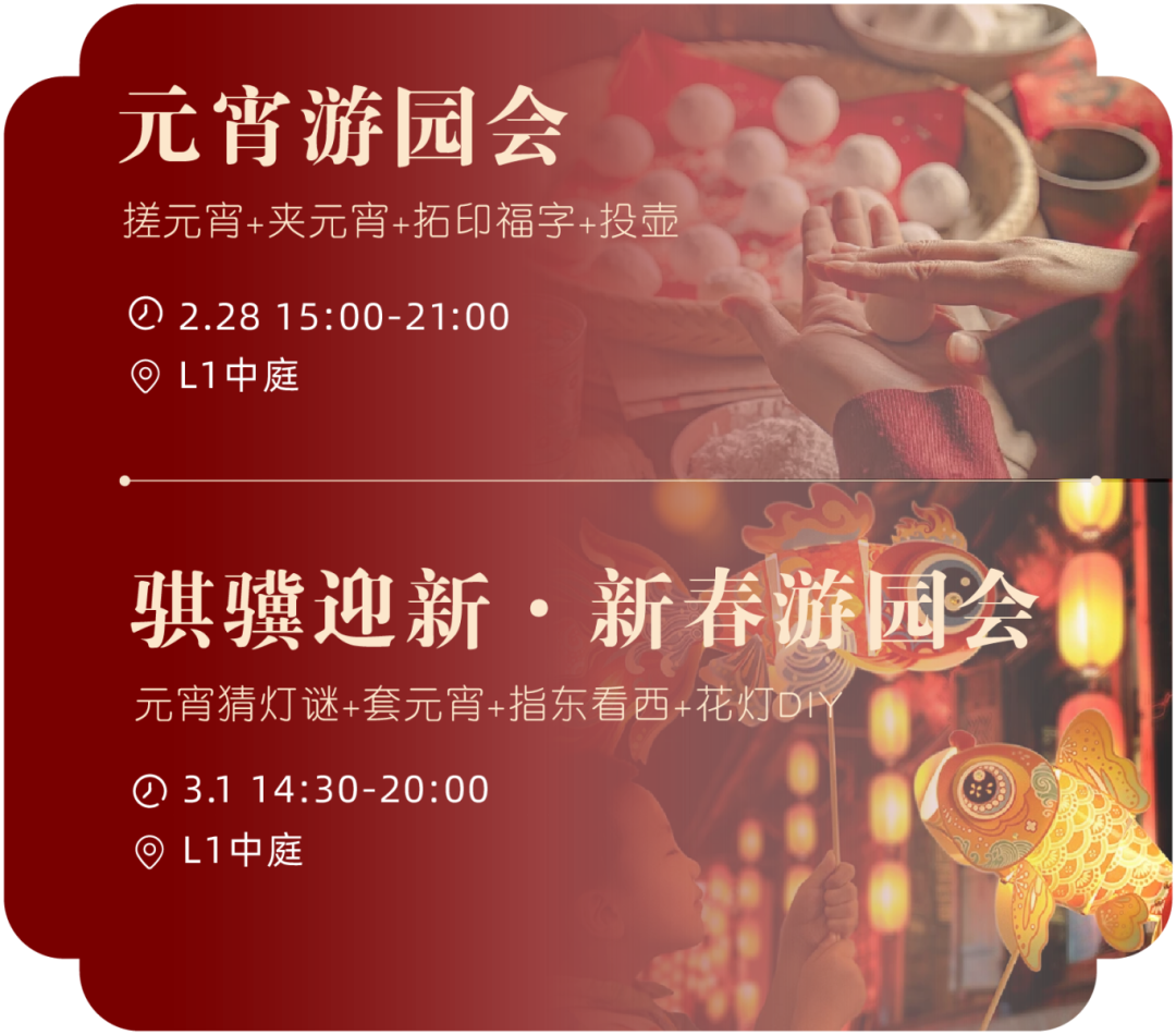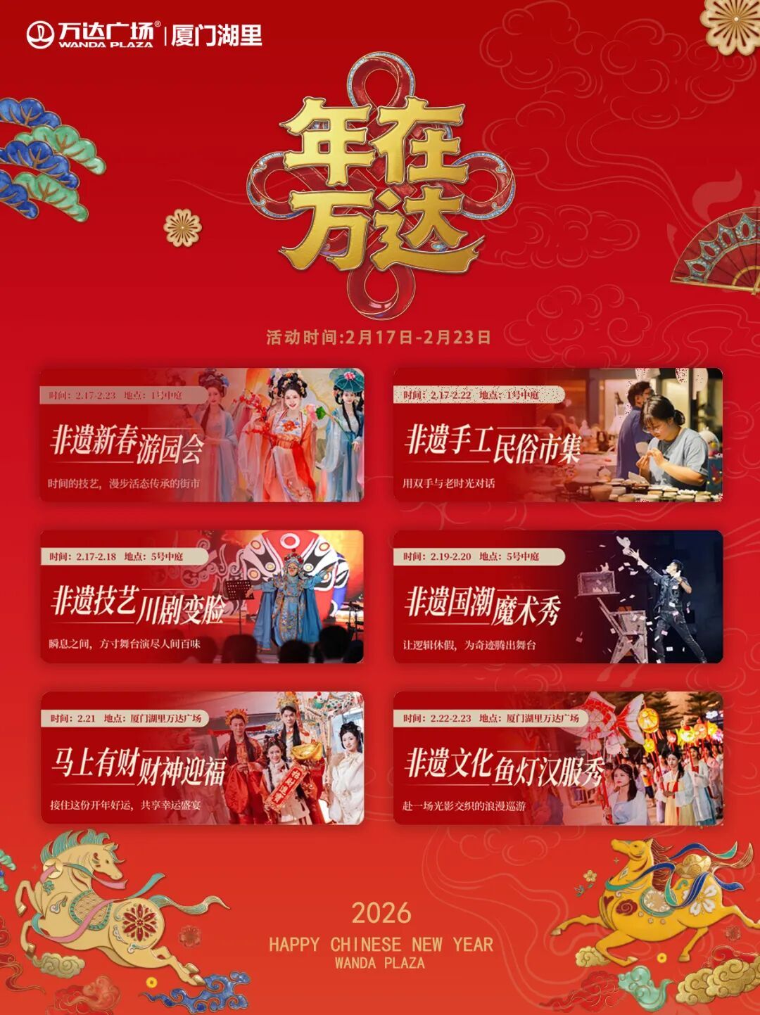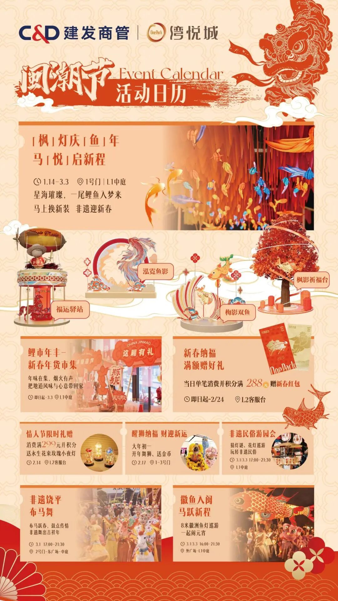 03厦门湖里万达广场 2月17日至3月3日 厦门湖里万达广场 推出系列新春活动 闽南新春花灯节及元宵灯会集市 新春集福活动 非遗民俗市集、非遗文化鱼灯汉服巡游 鱼灯表演及儿童非遗手工DIY 年味十足! 下滑查看具体活动内容