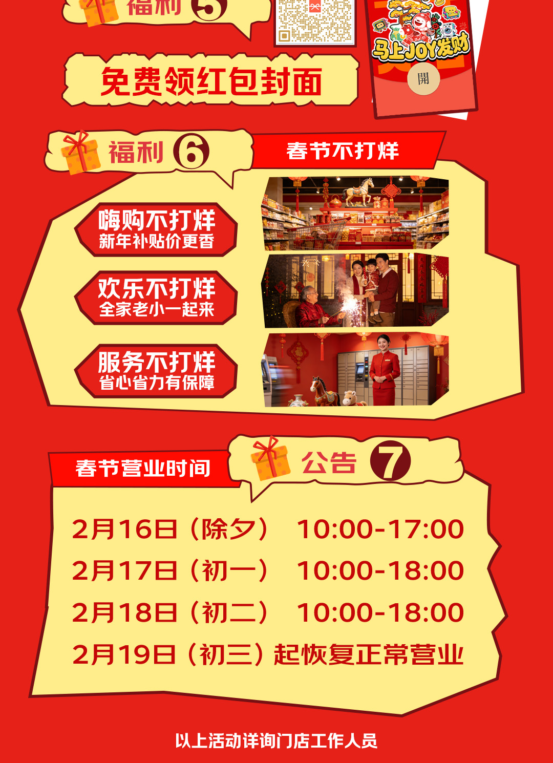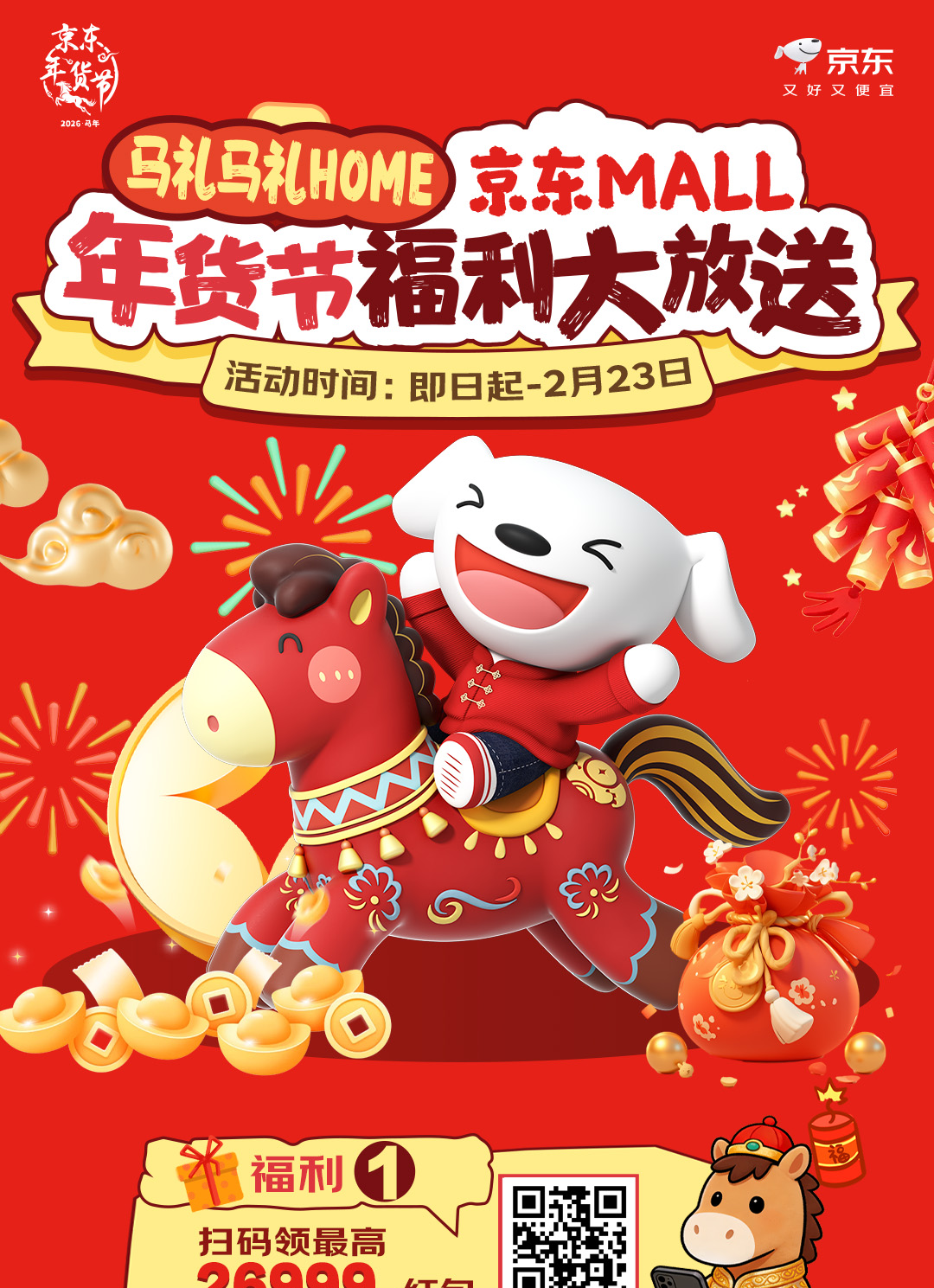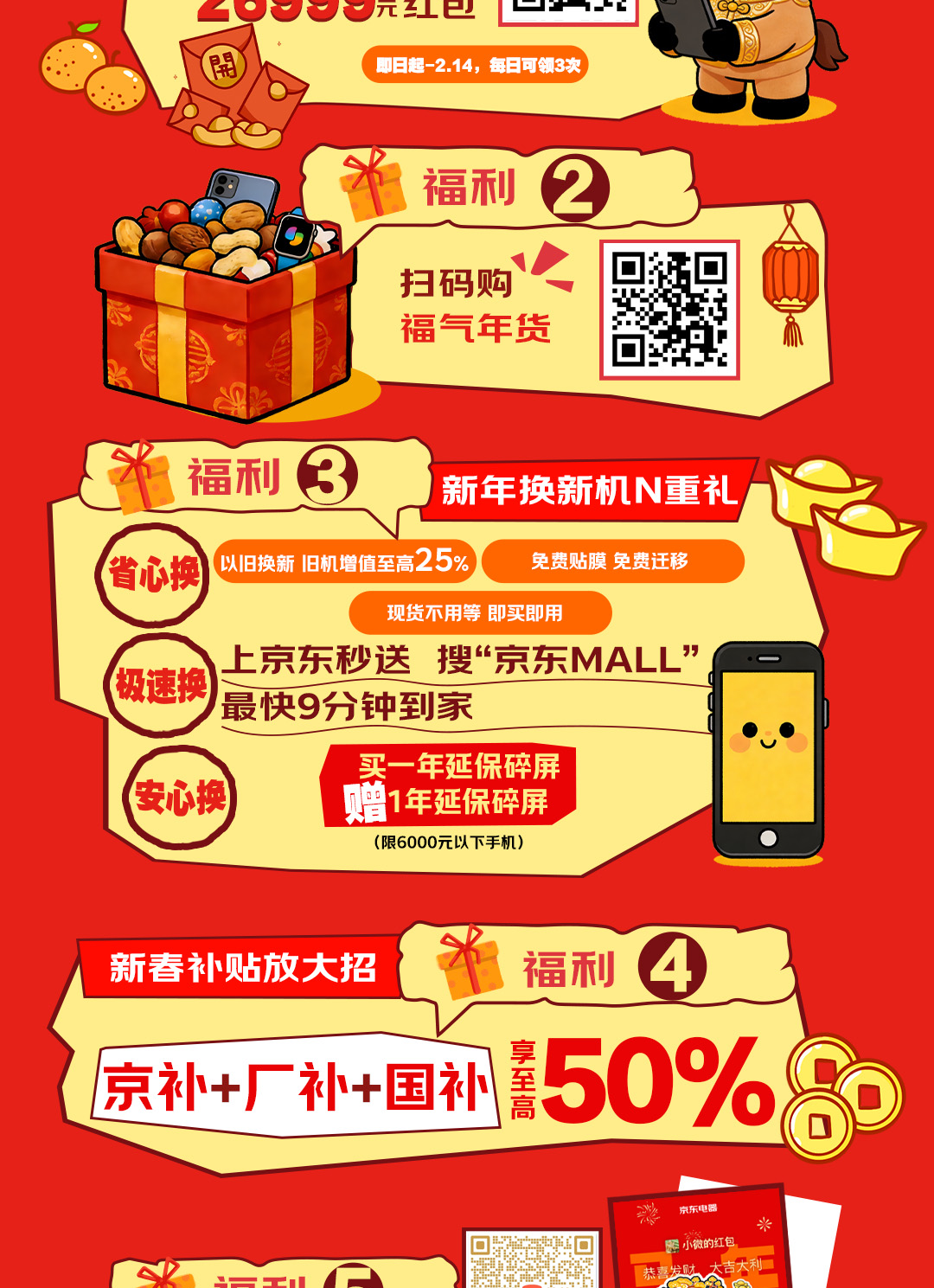 新年福利享不停!湖里商圈超多惊喜! 新年福利享不停! 湖里商圈超多惊喜 等你来解锁! 春节假期想在湖里 逛得尽兴、玩得开心、买得划算? 这份超全商圈活动合集请收好! 从购物满减、美妆特惠 到非遗展演、民俗互动 这个春节 湖里各大热门商圈带来 数十场特色活动 覆盖购物、餐饮、文化、打卡等多个维度 让你的春节假期精彩不停! 01、京东MALL厦门湖里店 骉新立亿过大年 京东MALL 2026年货节 福利大放送 即日起至2月23日 7重好礼嗨购不打烊 扫码领红包,每日可领3次 年货扫码购 京补+厂补+国补至高50% 手机以旧换新增值25% 最快9分钟到家 下滑查看具体活动内容