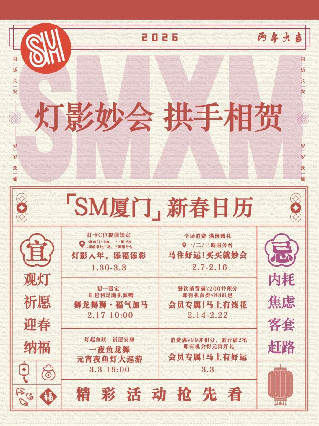 04SM厦门 消费满减・马年新春活动 即日起—2月16日 “马”住好运! 会员场内当日累计消费满额 可领红包袋/马年新春福袋 2月14日-2月22日 “马”上有福气! 会员餐饮单笔满200元并积分 有机会得88元红包! 民俗表演・瑞狮送福 2月17日(大年初一) 灯影妙会・瑞狮送福 舞龙舞狮轮番上演 更有现场红包派赠 邀你沉浸式感受传统民俗的热闹年味 灯影妙会・美陈打卡 即日起—3月3日 灯影妙会・拱手相贺 一期南门、旺街、中庭 二三期连廊 L1、三期中庭等 6大打卡点位上线 白天出片、夜晚氛围感拉满 新年灯影主题超好拍! 更多活动详情 敬请关注“SM厦门”公众号 05SM百货 2026幸福加马・马力全开 2月15日 —2月23日 大牌美妆满千减百 新春热卖继续 潮流鞋服低至5折起 开年舞狮采青、财神巡场送福 年味氛围感拉满! 下滑查看具体活动内容
