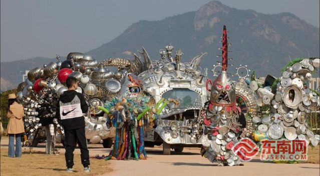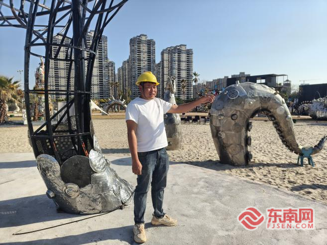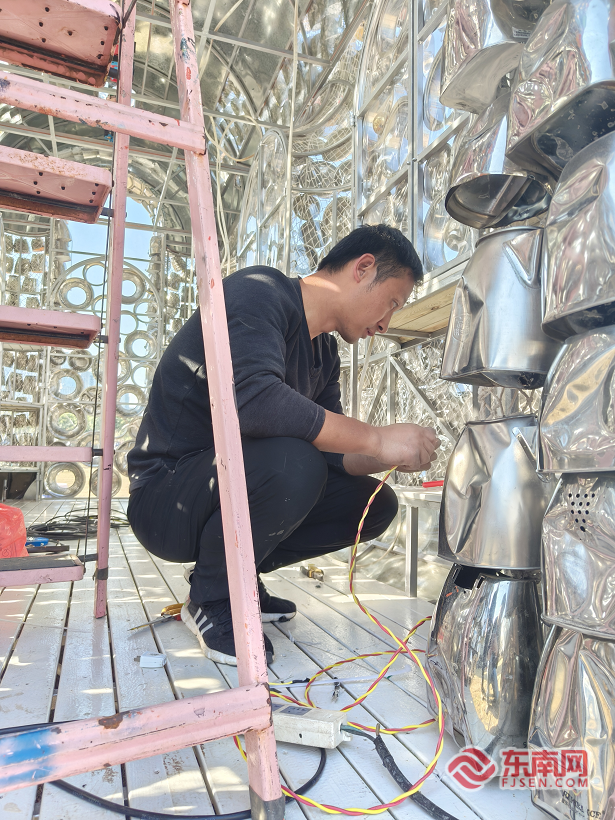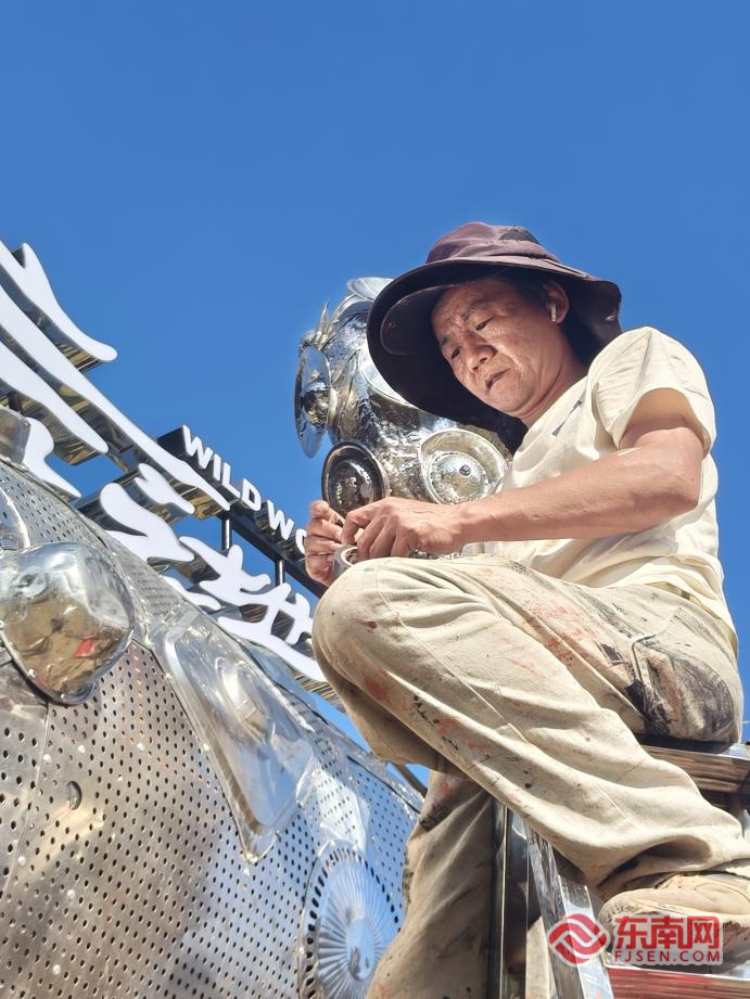 郭本实(受访者供图) 不远处的“狂荒之地”艺术展区内,37岁的组装工人郭本实正和工友们一起,组装由废弃金属打造的艺术装置。来自安徽寿县的他,负责各类装置的拼接、固定,烈日下,他双手紧握扳手,用力拧紧每一颗螺丝,身上的工装被汗水浸得发潮,却始终坚守岗位。“这些艺术装置都是用回收材料做的,每一块部件的拼接都要精准,既能保证安全,又要呈现最好的视觉效果。”郭本实说,虽然每天顶着烈日劳作很辛苦,但想到能为厦门打造一个特色文旅地标出份力,就充满了干劲。