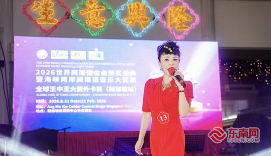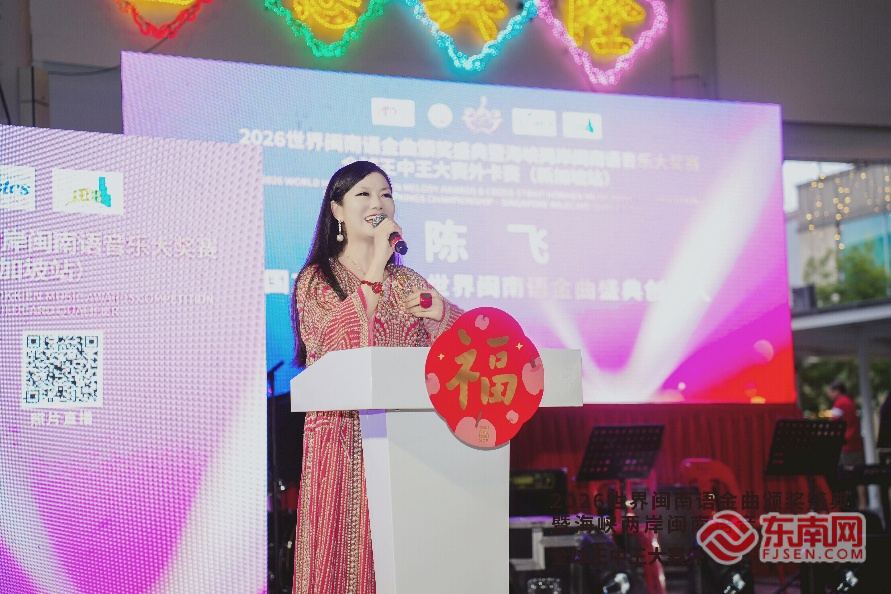 世界闽南语金曲盛典创办人、总导演陈飞致辞(主办方供图) 东南网2月22日讯(本网记者 段马水)2月21日,2026世界闽南语金曲颁奖盛典暨海峡两岸闽南语音乐大奖赛·全球王中王大赛外卡赛(新加坡站)在新加坡启幕。赛事在迎来二十周年之际,首度开启“全球王中王大赛”全新赛制的第一站,也是赛事立足厦门、辐射全球、链接五洲的又一次跨越。 多位嘉宾登台共襄盛举 中国驻新加坡大使馆文化参赞蔡山帝出席并致辞。他指出,闽南文化是中华文明走向世界的亮丽名片,随着一代代闽南人扬帆出海,已在全球160多个国家落地生根。当前中新关系站在“全方位高质量的前瞻性伙伴关系”新起点,希望以本次活动为契机,让更多新加坡朋友通过闽南语音乐感受中华文化魅力。 世界闽南语金曲盛典创办人、总导演陈飞深情致辞:“二十年前我从福建厦门启航,一路播种乡音;闽南语是阿嬷的摇篮曲,是八千万人共同的乡音,更是游子回家的路标。‘爱拼才会赢’从来不只是一句歌词,而是刻在我们骨血里的信念。愿它在每一代人心中永远年轻。” 新加坡演艺协会会长张仰兴动情地说,新加坡有逾百万闽南籍华人,闽南语是祖母的摇篮曲,是祖辈下南洋时行囊里的乡愁。25位本土歌手站上舞台,证明乡音不会因远渡重洋而沉寂,反而在多元文化的土壤里扎根生长,绽放出崭新的花朵。他愿与中方携手,推动狮城成为闽南文化联通全球的重要枢纽。
