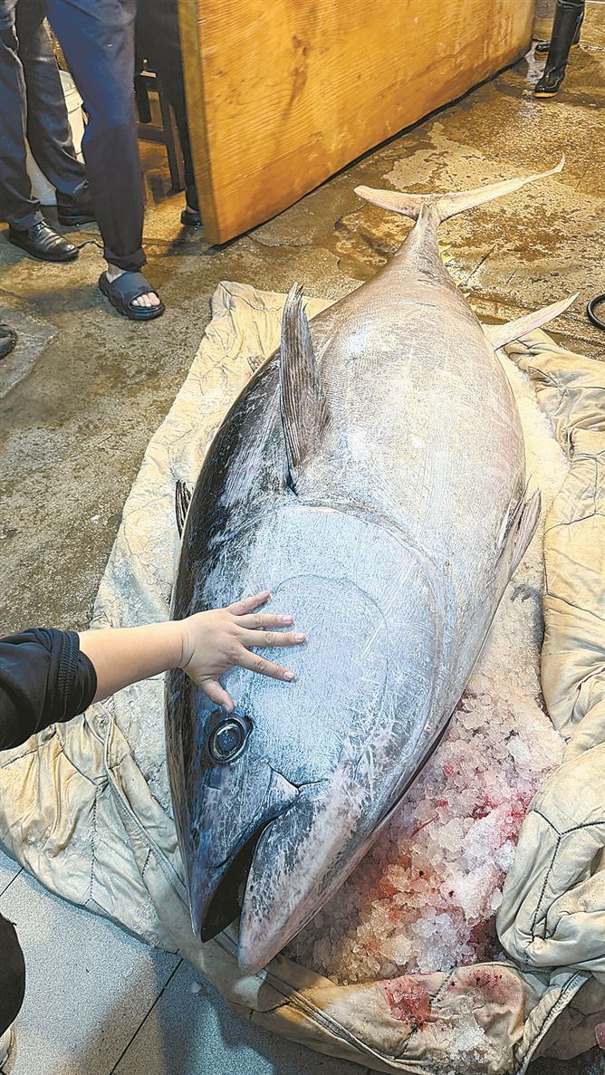 大块头蓝鳍金枪鱼吸引顾客好奇围观“比大小”。 厦门日报讯(文/图 记者 谭心怡)昨日早晨8点40分,厦门第八市场大鼓深海鱼店内已挤满了人。一条巨大的蓝鳍金枪鱼成为焦点。 这条蓝鳍金枪鱼重280公斤,体长2.37米,最宽处近0.6米。鱼身呈银灰泛蓝色调,背部乌黑发亮,腹部泛着冷白光泽,身形浑圆厚实、线条紧绷,宛如一枚刚从深海中被拖上岸的巨型“鱼雷”。据介绍,这应该是目前在八市出现的最大的蓝鳍金枪鱼。 为了让围观者更直观地感受这条鱼的庞大,现场有人铺开一张野餐垫,6名成年男性并排坐在地上,与鱼同框“比大小”。即便如此,这条鱼依旧显得格外壮观。比完后,在场的7名成年男性合力用麻布袋托起鱼身,将其放稳在一块长方形木头案板上,店主陈文勇则拿起水枪冲洗鱼身。围观的人越聚越多,有人踮脚张望,有人举着手机拍照录像,也有人当场询价下单,店里十分热闹。 据悉,在金枪鱼家族中,蓝鳍金枪鱼是最贵的物种,素有“海洋软黄金”之称,身价不菲。陈文勇介绍,捕这条鱼并不容易。他们先用活鱿鱼作饵,挂钩后在线上绑上气球,再将鱼线慢慢放出。待金枪鱼咬钩后,气球便会迅速下沉,船上人员由此判断鱼已上钩。由于蓝鳍金枪鱼爆发力强、耐力足,无法直接强行拖拽,只能驾船一路跟随,与其“周旋”耗力。陈文勇说,他和两名船员17日凌晨出海,5点多发现这条蓝鳍金枪鱼后,驾船跟了近5个小时,在台湾海峡附近的海域终于成功将其捕获。当晚6点左右,他把捕到大鱼的消息发到朋友圈,不到两个小时,鱼就被预订得差不多了,剩下一些肉准备分给朋友们品尝。陈文勇介绍,这条鱼售价每500克100元,与店里此前售卖的价格差不多。 陈文勇是龙海人,在厦门谋生多年。第八市场这家“大鼓深海鱼”是他父亲一手创立的鱼铺。为了处理这条“大块头”,店里特意请来了一位有着十几年经验的杀鱼师傅操刀,一个多小时就将鱼分割完成。见现场气氛热烈,陈文勇还切下一些靠近鱼骨的肉分给大家品尝,自己先尝了一口,笑着竖起大拇指:“好料!” |