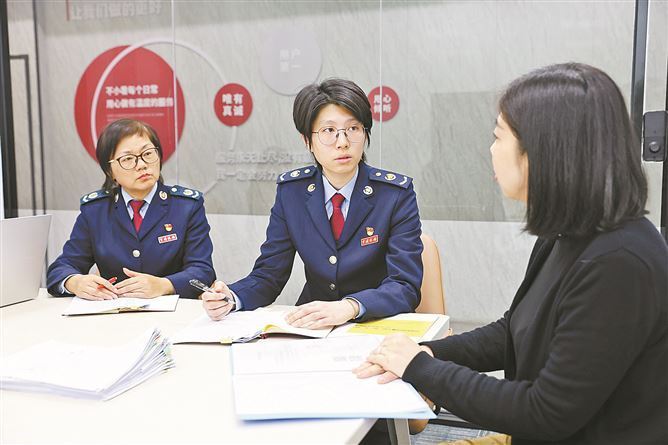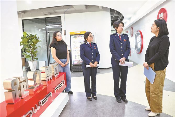 企业依托政府部门提供的电商“合规领航员”服务,主动对生产经营进行合规化升级,图为税务部门两名“合规领航员”(左二、左三)在跑红集团开展合规辅导与风险提示。(记者 唐光峰 摄)