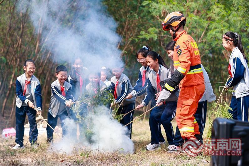 学生体验用树枝灭火(李为展 摄)