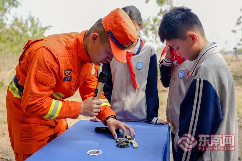 消防员教学生如何使用指北针(李袁辉 摄)