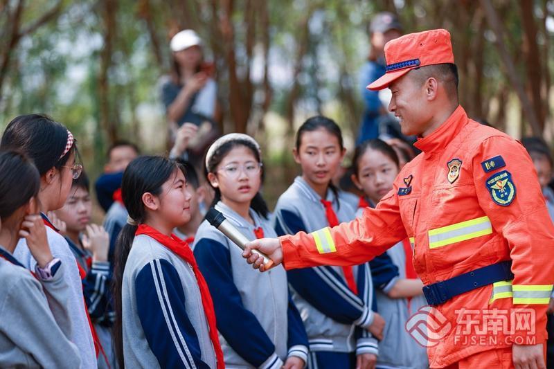 在第31个全国中小学生安全教育日来临之际,厦门消防救援机动大队的消防员把厦门双十中学海沧附属学校庚西分校的学生们带到户外,通过理论授课与实地体验的方式,教授他们户外踏青游玩时的安全知识和迷山自救的方法。