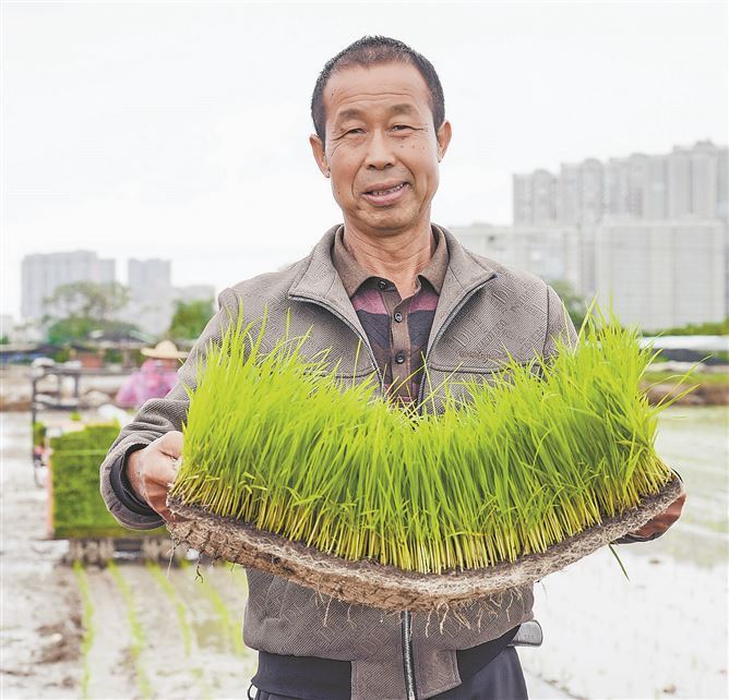 农户苏松柏展示自己即将种植的水稻秧苗。 厦门日报讯 (文/记者 吴晓菁 图/记者 卢剑豪)清明时节的闽南,春雨如酥。4月3日,清明假期前一天,在厦门同安康浔钓鱼场附近的一片农田里,机器的轰鸣打破了春日的宁静,厦门顺仔农机服务专业合作社的插秧机在细雨中开动,这也意味着厦门市今年早稻机械化插秧作业正式启动。 上午8时许,天空飘着小雨,田间作业井然有序。合作社负责人张志顺站在田埂上告诉记者:“今天计划插秧20多亩,秧苗都是3月10日育的,小雨天插秧效果最好,不影响作业还能滋润秧苗。” 田里,一台乘坐式高速插秧机正来回穿梭,青翠的秧苗被精准地插入水田,一行行、一列列,整齐有序。不远处,一台轮式拖拉机正在进行旋耕打地作业,成群的白鹭跟在机器后面,在新翻出的泥土中觅食。 “使用这台插秧机,一个人一天就能作业20多亩。要换成人工作业,十几个人得干好几天。”张志顺介绍。细雨之中,田埂上矗立的几根水泥柱略显突兀,他说,“这里原来是蔬菜大棚,此前种萝卜,如今稻菜轮作,土地活力满满,地里残留的大棚立柱虽稍碍作业,但我们的设备能适应。” 58岁的农户苏松柏正在田边查看插秧进度,谈及机械化插秧的感受,他连连感慨“轻松、高效”。“以前人工插秧,且不说劳累,还赶不上农时,现在机械化插秧省工省力,时间节约了不少。”苏松柏说,自己每年清明前后插秧,秧苗种下后约100天就能收获。 而厦门实打实的种植补贴,更是让苏松柏种粮没有了后顾之忧。厦门对水稻种植每亩补贴750元,购买全程机械化服务每亩最高补助450元,30亩以上还有每亩200元的叠加补助,基本覆盖种植全部成本。 “这补贴相当于让我们‘零成本’种粮,我们当然愿意多种。”苏松柏说,自己种的是又香又糯的丝苗香米,无农药、少施肥,天然种植的稻米深受周边村民喜爱,销路不愁。 随着“第一秧”插下,厦门春耕也进入大忙期。张志顺说,合作社共有5台插秧机,接下来每天会有2到3台外出作业,“要忙到早稻插完、中稻插完,一直忙到6月底。” 记者从市农业农村局获悉,为保障春耕生产,全市已统筹备妥各类农机具约3万台套,主要包括耕整地机具、播种机及水育插秧机等关键装备。预计今年春耕期间,全市机耕作业面积将达到2.8万亩,机械化主力军作用将进一步凸显。 |