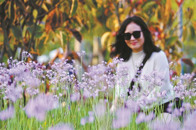 翔安中心公园盛开的紫娇花随风摇曳,市民游客在花间漫步、留影。