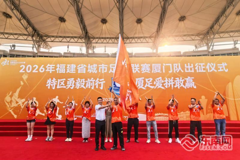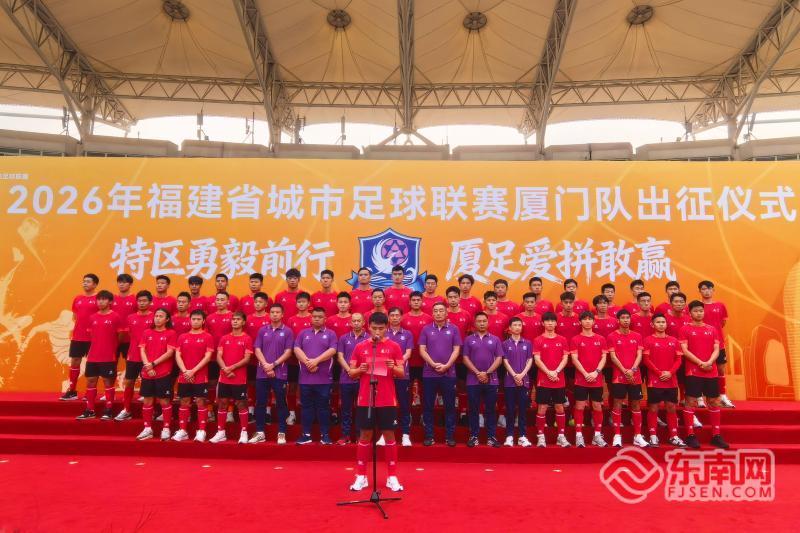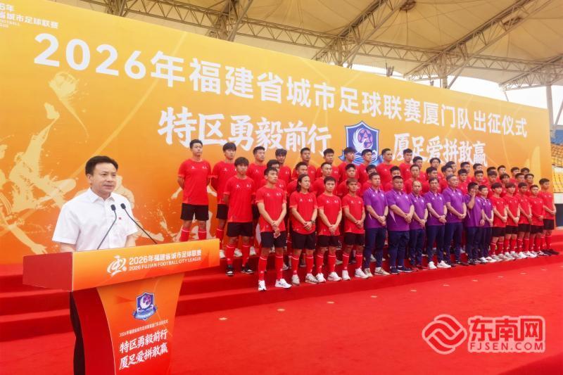 厦门市体育局党组书记、局长阮敦梁作动员讲话(东南网记者 刘玮 摄) 东南网4月16日讯(本网记者 刘玮)4月16日下午,厦门市体育中心体育场战鼓激昂、气氛热烈。2026年福建省城市足球联赛(闽超)厦门队出征仪式隆重举行,厦门足球即将踏上全新征程。 仪式上,厦门市体育局党组书记、局长阮敦梁作动员讲话,勉励全体队员以昂扬斗志、过硬作风展现厦门城市形象,在闽超赛场争创佳绩,并为球队代表授旗。球员代表带领全体队员庄严宣誓,许下顽强拼搏、全力以赴、为厦门争光的誓言。厦门市足球协会同步向厦门球迷团队授旗,期待球迷成为球队最坚实的“第十二人”,用呐喊与激情为球队客场助威。