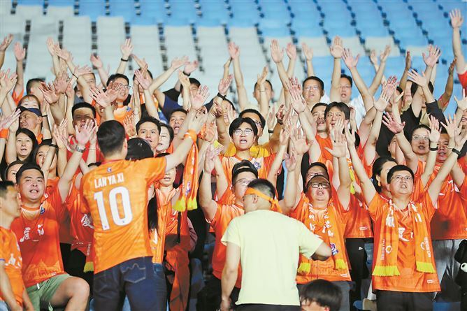厦门球迷助威团——厦门鹭战队昨晚也来到东看台进行助威训练。