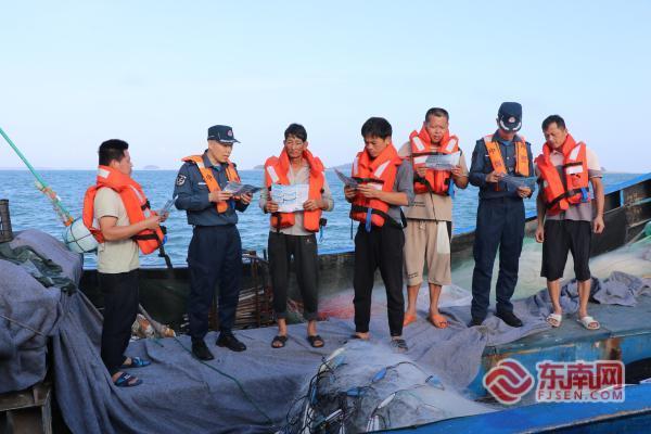 厦门海警开展登船宣讲(厦门海警局供图) 东南网4月30日讯(本网记者 刘玮 通讯员 余政煌 王家骏)5月1日12时起,厦门海域全面进入为期三个半月的海洋伏季休渔期。作为新修订《中华人民共和国渔业法》施行后的首个休渔期,厦门海警局立足“执法+普法”双轮驱动,组织辖区各工作站联动属地涉海部门,密集开展覆盖全域、精准到船、入心入脑的政策法规宣传活动,切实将伏季休渔制度转化为渔民群众的法治自觉,为守护“蓝色粮仓”、促进渔业资源可持续发展筑牢法治屏障。 连日来,厦门海警局联合各涉海涉渔部门,先后在重点码头、港岙口、渔村及船舶集中停泊点开展集中宣传行动。通过设立普法展台、张贴宣传海报、悬挂横幅标语、发放宣传资料、召开渔船民大会等形式,实现宣传触角延伸至一线渔村、渔船、码头和渔民家中。
