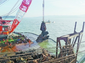 起重船将残骸收集起来。(本组图/周文龙 摄) 厦门日报讯(记者 徐景明 通讯员 余育成 张桂武 李毓苹)两艘分别于2003年和2015年在厦门港主航道旁沉没的船舶残骸,近日被成功打捞出水,为厦门港通航环境扫清安全隐患。此前,这两艘沉船一直被称为航道旁的两根“刺”。 两船在哪沉没? 沉没位置距厦门港主航道外侧边线都只有170多米 厦门港口管理局、厦门海事局、厦门航道保障中心等部门介绍,这两艘沉船分别是干货船“永超”轮、砂船“漳州货9039”轮,分别于2003年和2015年沉没,两艘沉船的位置都离主航道170多米。 资料显示,2003年10月29日,福州籍干货船“永超”轮在台湾海峡东碇岛以北5海里海域突遇大风浪天气,舵机失灵,船很快倾覆,沉没地点离主航道外侧边线仅178米。2015年2月11日,漳州籍砂船“漳州货9039”轮在青屿北面约200米处,机舱破损进水,船舶失控后沉没。沉船位于主航道18号浮附近,离厦门港主航道外侧边线只有172米。 为何现在打捞? 船东无力承担费用导致打捞长期搁置,成安全隐患 两艘沉船的长度均约55米,距低潮水面距离分别为13.6米和7米,这对于吃水较大的大型船舶来说,一旦脱离航道误驶入沉船区域,极可能发生碰撞事故,带来安全和环境风险,因此,这两艘沉船也被称为航道旁的两根“刺”。 此外,船舶沉没后有可能随水流发生位移,导致沉船的位置难以确定,影响通航安全;船载货物的性质以及油舱、管路、阀门的封闭状况也给海洋环境污染防治埋下隐患。 据悉,相关部门曾多次向这两艘沉船船东发出“限期打捞清除沉船的通知”,然而“永超”轮船东只打捞船上货物就声明无力承担沉船的打捞费用,“漳州货9039”轮船东声明无力承担沉船的打捞费用后便处于失联状态,使打捞工作长期搁置。随着厦门港主航道扩建四期工程完工投用,主航道进一步拓宽、增深,这两处沉船残骸对厦门港通航安全的影响愈加突出。 前不久,一艘大型集装箱货船就偏离航道,险些驶往“永超”轮残骸所在水域,在厦门海事局的及时干预下,这一险情及时化解。 打捞如何进行? 出动4330吨起重船,为防污染提前派潜水员探摸