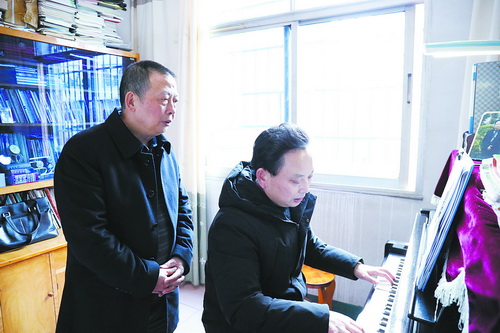 《感动》词曲作者陈德舜(左)与周鹏(右)共同探讨音乐创作。 (广安日报供图)