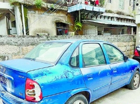 僵尸车停在居民区一堵矮墙下。(记者 赵张昀 摄)