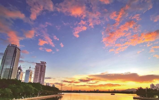 乌云、彩虹、“火烧云”……昨日鹭岛天宇瑰丽多彩 东南网6月16日讯 (海峡导报记者 朱黄)蓝天蓝的悠远,乌云暗的深沉。巨大的乌云带,带来的却是七彩彩虹,以及难得一见的火烧云壮观景色。 熄灭了火烧云,蓝色的夜景让人疯狂。惊艳、惊喜、惊奇,昨天的厦门是“瑰丽多彩”的一天。 昨天中午时分,筼筜湖畔,好一派碧水蓝天,明媚鹭岛的清新夏日景象。湖滨中路两边,绿树随风招展。