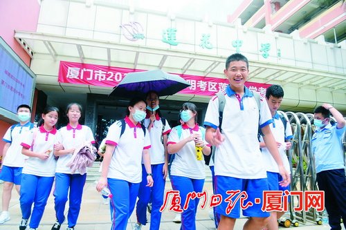 昨日上午11点多,考完试的学生心情不错。 (记者 张江毅 摄) 立牌手牌对联 送上祝福与加油 在接送考的环节中,金尚中学也做了别出心裁的布置:出、入考场时,考生能分别看到两副不同的红色对联,进校门时看到对联横批“微笑迎考”,出校门则是“圆梦远航”。金尚中学校长林洲辉告诉记者,两副对联对应不同的心境,也是全校老师们送上的激励和祝福。此外,各科任老师制作了融合学科特色的举手牌,如数学老师的“重心、内心、外心,题题顺心”“外接圆、内切圆、同心圆,圆圆满满”等,知识点和好彩头皆有。 而在莲花中学的校园东侧门口,摆放着一块巨大的加油立牌,除了祝福语,还印着学生在运动场奔跑冲刺的大幅照片。莲花中学副校长林蕾缨介绍,立牌上的照片是校运会场景,“学校之所以这样选图,是希望考生们能够突破自我,向前奔跑。”立牌顶端还用红绳挂着一串粽子,寓意学子“高中”。 在厦门十一中考点,考生们鱼贯穿过学校布置的一座大红“成功门”,在教师们的欢送中走向考场。 家长纷纷送考 盼孩子好好发挥 在金尚中学,除了教师们列队送考,家长义工队的代表们也组成了送考的“第一方阵”——6位妈妈身穿印着“金榜题名”的红色衣服,手举“金尚学子加油”牌子站在道路一侧;另有4位穿旗袍的家长代表手拿向日葵站在另一侧,寓意“旗”开得胜,一举夺“葵”。10位家长都戴着“逢考必胜”口罩,热情洋溢地为学子们加油。 当日早上,家长义工队成员肖金玉目送自己的孩子进了考场,自己则继续站在方阵里,为其他孩子加油助威,直到考生全部进入考场。“希望每个孩子都有好的发挥,考上心仪的学校。” 肖金玉说。 “加油立牌印着的照片上,冲在最前方的那个黑衣小伙,就是我儿子!”家长苏先生和叶女士目送儿子进入莲花中学校园后,指着门口的加油立牌对记者说,这是儿子初三参加校运会200米比赛时拍下的照片,当时还破了校纪录。苏先生还说:“孩子昨晚睡得很香,今天轻松上阵,我们倒是比孩子还紧张,一晚没睡好。” |