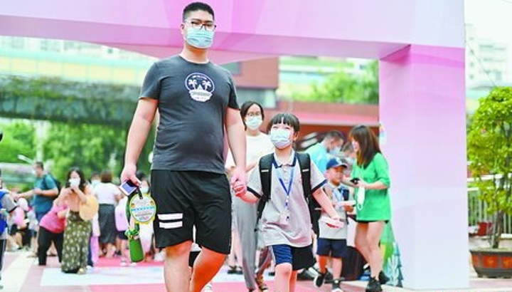 厦门五中小学部一年级学生在家长陪伴下入校。