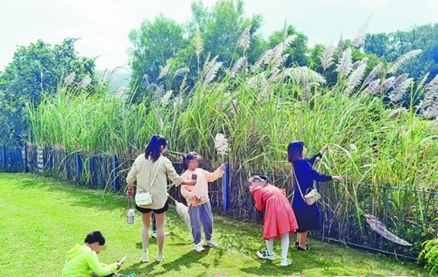 上李水库公园内,有人扯断芦苇枝干,拿着花穗拍照、嬉戏。