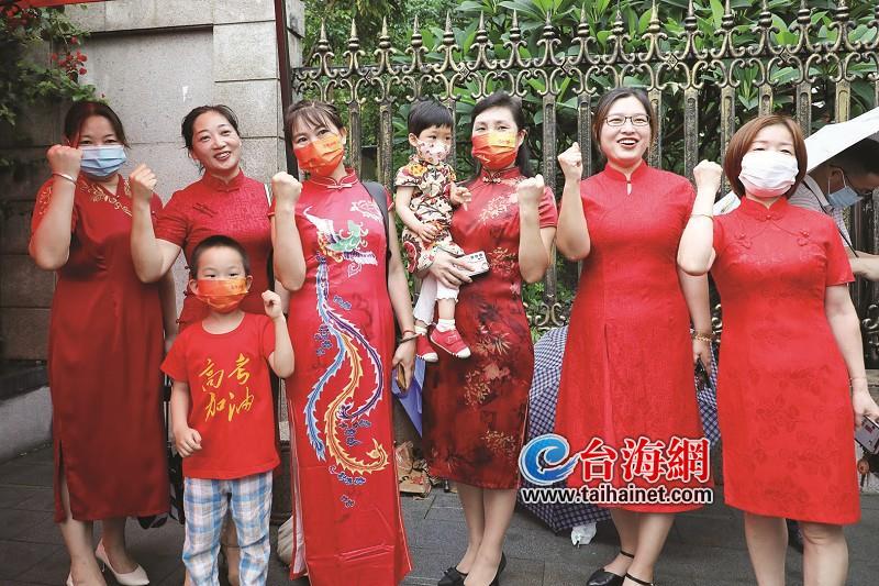 高三(2)班曾同学的妈妈目送孩子进校后迟迟不舍离去。她和记者分享说,四年前大女儿参加高考时,她就穿着红旗袍来送考,最终女儿取得了满意的成绩,今年再次穿上红旗袍希望能延续好运,助儿子考上心仪的大学。而一旁的段阿姨不仅自己身穿红旗袍,老公也穿上了红色T恤,夫妻二人一同送孩子来考试。 不一会儿,红帐篷下聚起了一群“旗袍妈妈”。“我们一起录视频吧!祝厦门一中的孩子们一举夺魁,旗开得胜!”对着记者的镜头,家长们热情洋溢,自发为孩子送祝福。 二宝喊加油 为哥哥姐姐“打气” “哥哥加油!”“姐姐,爱你哦!”厦门一中考点外,送考的除了爸爸妈妈、爷爷奶奶,还有一些稚嫩的面孔——他们都是家里的“二胎宝宝”,和父母一起来送哥哥姐姐参加高考。 陈先生和妻子一人抱着小女儿,一人负责撑伞遮雨,送大女儿进校门时停了下来,请记者们帮忙拍照,留下了一家四口的合影。这张特别的全家福里,爸爸穿着红上衣,妈妈穿着红旗袍,小妹妹的花裙子外面也披着一件红马甲,十分喜庆。陈先生说:“全家上阵给大女儿加油,祝她今天取得‘开门红’。”