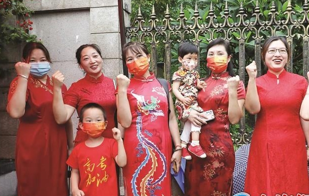 东南网6月8日讯(海峡导报记者 梁静 曾艺轩 曾宇姗 郑丽金 康泽辉 吴鹏波 见习记者 郑炜/文 沈威 常海军 陆军航/图)高考首日,厦门各考点外都是红红火火的好彩头! 昨天高考第一科语文开考前,考生家长们着红衣、穿旗袍、戴红口罩、举向日葵、持“旗开得胜”旗,轰轰烈烈来送考;特警公安、义务交警、学校安保等全员上岗,为考生保驾护航;考生们测温安检、有序入场。 今年厦门全市有1.92万名考生报名参加高考,全市共设6个考区、22个考点、768个考场,全省共有21.8万名考生报考,共设87个考区、221个考点、8465个考场,另设有115个备用考点、1062个备用隔离考场、87个备用病房考点(考场),抽调监考员等考试工作人员4.5万人参与考务工作。 高考进行时,乾坤未定,你我皆黑马!祝愿所有考生轻装上阵,从容应考,落笔生花,不负青春! “旗袍妈妈团”助阵 送上“开门红”祝福 如果幸运有颜色,那一定是中国红。昨天上午7点出头,天空便下起淅淅沥沥的雨,虽然雨势越来越大,但厦门一中思明校区考点外的一抹抹“红”却越来越鲜艳。校门口共设置3条进校通道,穿着红衣的老师们列队迎接,和学生击掌、拥抱;校门外,红雨伞、红帐篷、红旗袍、红T恤,送考家长们无一不想为孩子集齐好运,送上“开门红”的祝福。