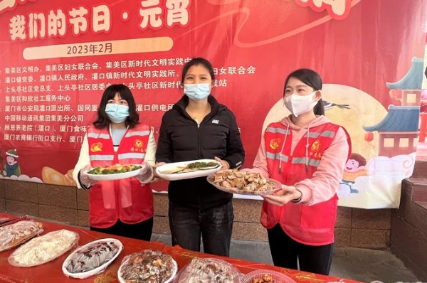 居民精心烹调拿手好菜,齐聚一堂“品味”邻里情。(东南网记者 李霖 摄) 话民俗“品味”邻里情 有诗云,每逢佳节倍思亲;又有俗语说,远亲不如近邻。3日下午,在集美区灌口镇上头亭社区,一场其乐融融、温馨热闹的元宵邻里聚会在这里上演——居民们争相体验猜灯谜、抽福袋、剪花灯、投壶等传统民俗活动;志愿者从旁开展闽南美食文化、反诈防骗、惠民政策等宣传工作。 这是“共享百家宴,畅叙邻里情——我们的节日·元宵”主题活动现场。当天下午四点,本次活动的重头戏——百家宴正式开席。除了有姜母鸭、海蛎炸、同安封肉等闽南特色小吃,小酥肉、粉蒸肉、客家芋子包等各地知名美食也轮番登场,居民们在品尝美食之余,还挽起袖子揉面团、搓汤圆,欢聚一堂吃汤圆、庆团圆。 值得一提的是,此次百家宴有五十多道菜品为居民精心烹调,福州人李女士的清蒸金鲳鱼就是其中之一。在这里工作生活了十多个年头,李女士经常参与社区举办的各类文娱活动,集美已经成了她的“家”,她说,“取‘金’和‘昌’的美好寓意,借这道菜祝在座的邻里年年有余!” 灌口是集美的工业重地,外来人员密集。上头亭社区书记徐燕蓉告诉记者,此次活动旨在弘扬优秀传统文化,传承爱老敬老传统美德,也让新老居民在传统佳节的喜庆氛围中增进交流,感受社区大家庭的关爱,让大家更有获得感、认同感和归属感。