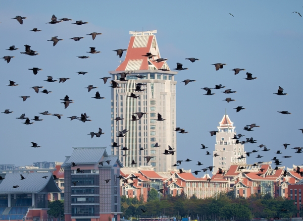 成群普通鸬鹚飞抵厦门集美杏林湾。周龙杰摄 人民网厦门1月10日电 (陈博、余乃鎏)近日,在厦门集美杏林湾畔,万余只普通鸬鹚如约而至,它们时而成群结队在天空中盘旋,时而俯冲向水面觅食嬉戏,场面颇为壮观,吸引了不少游客和观鸟爱好者前来观赏拍照。 厦门市观鸟协会副会长陈浩介绍,此次到厦门过冬的普通鸬鹚,又被称为“鱼鹰”,通体黑色,头颈具紫绿色光泽,两肩和翅具青铜色光彩,嘴角和喉囊黄绿色,眼后下方白色,繁殖期间脸部有红色斑,头颈有白色丝状羽,下胁具白斑。该鸟种常成群栖息于水边岩石上或水中,呈垂直站立姿势,善游泳和潜水,以各种鱼类为食。 在厦门园林博览苑的观鸟长廊可以看到,成群鸬鹚贴着水面飞行围猎鱼群,鸣叫声、戏水声此起彼伏,好似一股股黑色旋风。在园博苑内,则有大白鹭、苍鹭、潜鸭等多种鸟类,为杏林湾带来了生机和乐趣。 “冬季到来后,厦门市各大公园、湿地等迎来了大批候鸟。”厦门市自然资源和规划局相关工作人员介绍,近年来,厦门不断加强环境治理,通过湿地生态修复、改造生态小岛、保护区封闭管理等一系列措施,使杏林湾等地的生态环境不断优化,已成为名副其实的鸟类天堂。