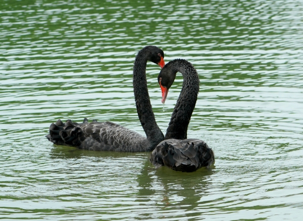 在厦门集美园博苑澳门园,两只黑天鹅在湖面上“比心”秀恩爱。张秀云 摄
