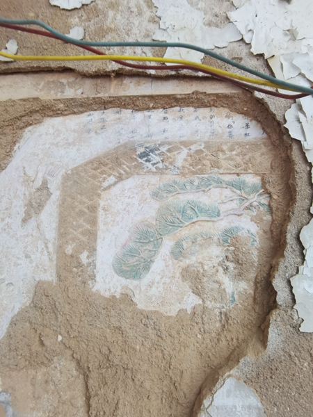 在鳌园入口大厅的墙壁内发现了尘封多年的灰塑壁画。(林桂桢 摄) 近日,集美鳌园景区启动陈嘉庚墓(鳌园)保养维护工程,施工过程中在鳌园入口大厅的四面墙壁内发现了尘封多年的灰塑壁画。 “由于窗户漏水,我们维修前要拆除墙上的展示架。工人施工时发现墙壁空鼓,用手轻轻剥开墙面,看到里面覆盖着一层黄土,底下好像有彩色图案。我们用刷子小心翼翼地把黄土刷掉,一幅灰塑就显现出来了。”本次陈嘉庚墓(鳌园)保养维护工程的施工单位厦门万圣形意堂建筑工程有限公司副总经理陈泽诚回顾了3月1日下午发现灰塑壁画的过程,“我们立即停止作业,通知景区工作人员,集美学校委员会工作人员第一时间到场查看。” 这些灰塑大部分还被尘封在墙壁内。3月2日,记者在现场看到,其中已经“露面”的一幅灰塑色彩淡雅,风格疏朗,一棵青松图案和“梁红玉”等字迹清晰可见,描绘的疑似是“梁红玉击鼓退金兵”的故事。