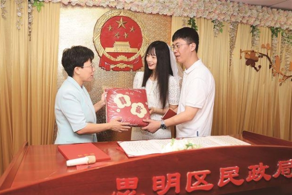 领完证打场球 庆祝国乒夺冠 不少新人选择七夕这天登记结婚,庆祝方式各种各样 思明区人大代表向新人颁发结婚证书、赠送礼物。 湖里区的新人在婚书上按手印 汪燕妮 摄 厦门晚报讯(文/记者 戴懿 汪燕妮 实习生 曾家怡 通讯员 赵连飞 图/记者 刘东华)今天是我国浪漫的传统节日“七夕节”,也称“中国情人节”,许多新人选择在这一天喜结良缘。今天上午,思明区和湖里区的婚姻登记处都迎来了不少新人。他们或手捧鲜花、或戴着头纱,还有人带来了专业的摄影,记录下最美这一刻。 今天是林小姐和张先生恋爱两周年的日子。两人是同事,在工作中日久生情,慢慢就走到了一起。林小姐说:“我们提前三天抢号,但没抢到。昨天进预约系统看了一下,没想到‘捡漏’了,真是运气太好了!” 虽然从家到婚姻登记处只有10分钟的路程,但王小姐还是起了个大早,换上礼服、戴上头纱、画上精致的妆容。王小姐和林先生认识3年多,虽然林先生不善言辞,却一直用实际行动呵护着王小姐。“我加班,他会为我煲汤;我下班,他还专门从岛外来接我。”王小姐幸福地说。 杨小姐和郭先生的缘分则很奇妙。“我们是相亲认识的,没想到我们就住在同一个小区,双方的父母早就认识了。”杨小姐说,爱情并不需要轰轰烈烈,而是感觉对了就成,“他很有责任感,我觉得遇到了合适的人。” “最近看奥运会,她迷上了乒乓球。”上午,在湖里区结婚登记的第一对新人邱先生说,领完证,他会跟爱人来一场酣畅淋漓的乒乓球运动。“为了今天领证,我们早早做了准备,这种天气不能穿正装,否则会汗流浃背。我们商量决定,她就画个淡妆,我就涂点素颜霜,这样精气神更好。” 问起领证后两人打算怎么庆祝,邱先生说,他们会先跟家人一起吃饭庆祝一下,接着会以打乒乓球的方式庆祝这个特别的日子,“昨天男乒团体在奥运会上夺冠了,我们今天领证,也预祝今天女乒团体能夺冠”。 服务 人大代表颁证 免费提供头纱 今天,思明区民政局联合多家单位为新人们送上幸福大礼包。区人大代表、区政协委员为新人们宣读颁证词并颁发结婚证。奈雪的茶为新人们送上饮水杯,寓意“一对一辈子”。现场还布置了特色打卡点,并开展“为爱而来”新婚夫妻幸福密码解锁活动,免费提供头纱、拍照等服务。 |