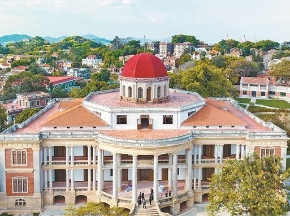 修旧如旧重新布展 百年八卦楼正青春 转型为综合性景点,继续见证鼓浪屿在保护中发展、在发展中保护的创新实践 八卦楼融合了中西方建筑经典元素。(记者 林铭鸿 摄) 厦门日报讯(记者 朱道衡)作为近代中外文化包容并蓄发展的城市典型,厦门是中国东南海防重镇与海上丝路的重要门户,是两岸同根同源的桥头堡,经历了与世界不同文化文明的碰撞和融合发展。 红色穹顶、坐落于鼓浪屿笔架山的八卦楼,是我市丰富历史文化遗存的代表。作为全国重点文物保护单位、重点保护历史风貌建筑,八卦楼是鼓浪屿世界文化遗产核心要素之一,也是琴岛为数不多的古典复兴式建筑,融合了中西方建筑经典元素。 按照“不改变文物原状”原则,八卦楼经过近3年的修缮提升,今年2月与公众重逢,由过去单一展示风琴转型为展示建筑、历史、音乐,兼具游学、观光、休闲功能的综合性景点。 如今,碧海蓝天间,保护修缮后的八卦楼头戴红色礼帽,闪耀着特有气质,古老而又青春。历经百年风霜,它仍以端庄平和之姿,俯瞰鹭江两岸,继续见证当代厦门的蓬勃发展。 多元包容 见证中西文化交融并蓄 鼓浪屿是很多人心目中文化旅游的理想之地,在这里可以感受东西方文化碰撞、欣赏万国建筑风情。乘船上岛,远远就能看见八卦楼。“红色穹顶,在一片绿树中很显眼。”学建筑的江苏游客谢望对八卦楼很感兴趣。 来到这栋体量和高度皆为鼓浪屿老别墅之最的建筑前,谢望虽然提前做了功课,仍被八卦楼震撼到。这栋大型别墅占地面积约11000平方米,主楼建筑面积约6300平方米,坐北朝南,面宽53.3米,进深33米,高26.6米。 走近八卦楼,高两层的塔斯干巨柱外廊,雄浑刚劲,激发人们对其身世的好奇。“八卦楼由台湾商人林鹤寿于1907年投资兴建。当年,他希望建造一座风格独特、能够看到厦门和整个鼓浪屿的新颖大别墅。”鼓浪屿管委会副主任陈辉杰介绍,由于建筑规模过大,林鹤寿甚至回台湾变卖土地家产筹集资金。 简洁庄重、雄伟宏大……八卦楼不负林鹤寿的期许,吸纳了外国古典建筑的诸多元素——三段式立面和对称平面、圆形大厅和中央穹顶、古典柱式和三角形山花等。红色穹顶有八条棱道,整体造型与文艺复兴时期著名建筑佛罗伦萨主教堂的红色、八面穹顶颇为相似。 在细节和用材上,八卦楼兼具闽南传统建筑特征。整座建筑如花岗岩、青草石、闽南胭脂砖、屋面红瓦等都属于当时厦门本土常见的建筑材料。主体大楼屋檐下一圈内凹的水平空间,还保留着模仿闽南红砖民居屋檐下的“水车堵”装饰带。此外,它的防潮架空层及四周的石砌敞廊也不同于西方半地下室的处理,而是融合了东南亚引进的架空层的做法,体现了多元文化的碰撞与交融。 惊喜不断 遗失15年石花座“回家” 从诞生到经历至暗时刻,再到新中国成立后的重新启用……在漫长岁月里,八卦楼饱经风霜,高大的身躯略显衰老。1986年,时任厦门市委常委、副市长的习近平同志专门指示拨款,推动八卦楼的修缮工作。 老建筑的命运从此彻底扭转。整修后的八卦楼,不仅是鼓浪屿历史风貌建筑修旧如旧的样板,也成为鼓浪屿申报世界文化遗产的核心要素之一,获得世遗专家认可。身为中西文明交汇产物的八卦楼,见证鼓浪屿在保护中发展、在发展中保护的创新实践。 2021年,我市开展鼓浪屿申遗成功后最大规模的文物修缮项目——八卦楼新一轮修缮提升,坚持“不改变文物原状”原则 ,尽可能保持原形制、原结构、原材料、原工艺,赋予其新生。 除了提升建筑的抗震性、安全性以外,历史信息也被最大限度地保留和修复,带着清晰木质纹理的红褐色门窗也被还原,这栋百年建筑恢复更真实的原貌。“采用研究性修缮施工方法,先做实验,确认无误,再应用到实际修缮中。”陈辉杰说,门窗的脱漆上漆就像女生买化妆品,先在手上试色,看过不过敏,精心挑选后再上脸。 本次修缮惊喜不断,修缮人员还找回八卦楼遗失15年的一对石花座。市博物馆陈列着许多石雕文物,工作人员通过对比老照片,发现其中一对石花座,其实属于八卦楼。 1987年至2004年,八卦楼曾作为市博物馆使用,2005年市博物馆迁往厦门岛内,这对有着一百多年历史的石花座随之遗失。经研讨,鼓浪屿管委会与相关部门达成共识,让这对石花座“回家”,八卦楼越发接近原来的模样。 独具特色 主附楼功能分区更鲜明 今年,修缮提升、重新布置展陈的八卦楼,在保护中重生,成为展示建筑、历史、音乐,兼具游学、观光、休闲功能的综合性景点。登上八卦楼三楼天台,厦鼓全景尽收眼底。整个景点对外开放面积扩大到原来的6倍多,由约1800平方米增至约12030平方米,主、附楼功能分区更加鲜明,展陈独具特色。 主楼部分,一层仍作为“国内唯一、世界一流”风琴博物馆,根据风琴发展历史,设立中庭展厅和八个专题展厅。镇馆之宝,也是体量最大的藏品“诺曼·比尔”管风琴依然处于一楼中庭的中心位置。二层被新设为手风琴展厅及艺术展厅,三层及地下架空层被新设为开放会议、论坛、文创、非遗研学及休闲空间等。 附楼则被改造为“桂冠上的明珠”专题展览馆,运用视频、音乐、图片、文字资料等综合方式,介绍八卦楼的历史、文化、建筑艺术价值等情况。陈辉杰介绍,在展厅方面,设置了较先进的多媒体互动设备。在这里,游客仿佛穿越时光隧道,聆听这栋百年历