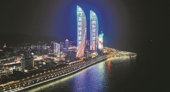 为迎接盛会到来,我市以灯光秀等多种形式营造氛围。图为昨晚世茂海峡大厦为本次设计艺术周亮灯。(记者 许秋珩 邬秀君 摄影报道)