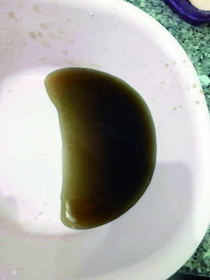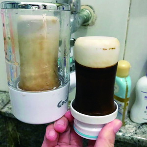 学生们在水龙头上装滤芯,但用不了多久,滤芯就成深色。