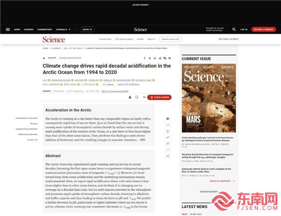 该研究论文在《Science》刊发的页面截图(集美大学供图) 东南网9月30日讯(通讯员 罗旻敏)9月30日,集美大学(第一完成单位)港口与海岸工程学院极地与海洋研究院科研团队在Science(IF=63.7)在线发表题为“Climate change drives rapid decadal acidification in the Arctic Ocean from 1994 to 2020(《气候变化导致1994年到2020年北冰洋快速的年代际酸化》)”的研究论文。 据悉,这是集美大学首次以第一完成单位在《Science》刊发研究成果,实现了科研工作的历史性突破。据悉,这也是我国近20年来在海洋科学领域以第一单位和第一作者身份发表的仅有的几篇Science文章之一,具有极强的原创学术价值,引起了国际学术界广泛关注和巨大反响。 该研究集成北冰洋28年船载观测数据,揭示北冰洋海洋酸化速率为全球最高,且为全球其他开阔大洋的3-4倍,并进一步提出“ice melt-driven enhanced anthropogenic CO2acidification(融冰驱动增强人为CO2酸化)”的创新机制,阐述了气候变化下北冰洋海冰退缩是导致快速酸化的幕后推手。 据该论文第一作者、极地与海洋研究院科研团队祁第教授介绍,北冰洋快速酸化将对海洋生物造成重大影响,尤其是蛤蚌、贻贝、海螺等钙质外壳生物将更难形成或维持其外壳。翼足目类海螺是北冰洋食物链中重要的一环,是北极三文鱼和鲱鱼重要的食物,其总量下降将对北冰洋生态系统造成严重影响。他提出,要减缓全球海洋酸化的速度,治理的根本措施要以人类命运共同体为理念,坚定不移地实施“碳达峰”和“碳中和”战略,同心协力加强减排和增汇,以应对气候变化威胁和保护海洋生态系统。 祁第所在的集美大学极地与海洋研究院成立于2021年9月,是国内最早开展海洋酸化、碳循环研究的队伍之一,瞄准海洋酸化与碳循环对全球气候变化影响的国际前沿科学问题,通过中美、中俄、中英、金砖国家等国际合作,取得一系列最新的发现和显著成果。 据了解,集美大学讲座教授陈立奇、美国特拉华大学教授Wei-Jun Cai为该论文的共同通讯作者。极地与海洋研究院副教授吴瀛旭、教授庄燕培为文章合作作者。本研究的合作单位包括自然资源部第三海洋研究所、美国特拉华大学、中国极地中心、自然资源部第二海洋研究所、中山大学、美国NOAA等国内外知名科研院所。研究得到国家重点研发计划、国家自然科学基金、中国南北极考察评估项目、中国科学院海洋大科学研究中心重点部署项目、中国极地研究中心的支持。 |