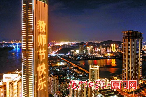 绿发大厦的教师节庆祝主题灯光。(记者 林铭鸿 摄) 9日晚,厦门多地为教师节亮灯。世茂海峡大厦、绿发大厦、中闽大厦,以及厦门市人民会堂、金尚路与莲前西路交会处LED屏,高频率滚动刊播庆祝教师节的标语:“老师,您好”“教师节快乐”“老师,您辛苦了”等。昨晚,各单位广泛利用户外大屏、地铁公交、楼宇电视等公共宣传平台刊播 “为教师亮灯” 宣传标语。 |