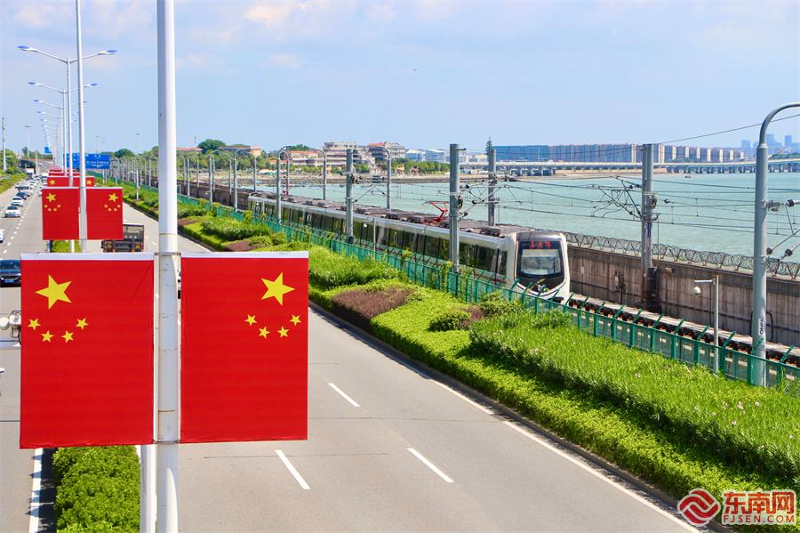 五星红旗与嘉庚号地铁列车同框(东南网记者 李霖 摄)