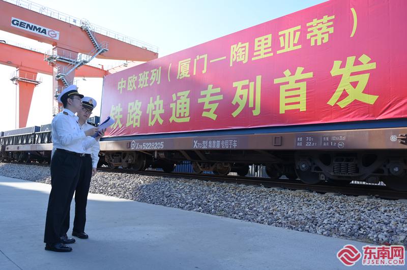 11月27日凌晨,一列满载日用品的班列从厦门国际物流港监管场所缓缓驶出,将通过满洲里口岸出境发往欧洲。