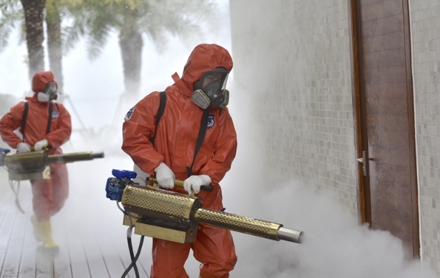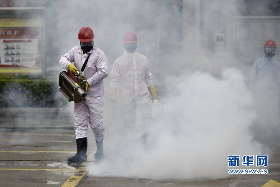 身穿专业防护服、戴护目镜的消杀人员使用弥雾机、喷雾器等设备,对垃圾转运车、雾炮车进行卫生消杀。新华网发(陈嘉新 摄)