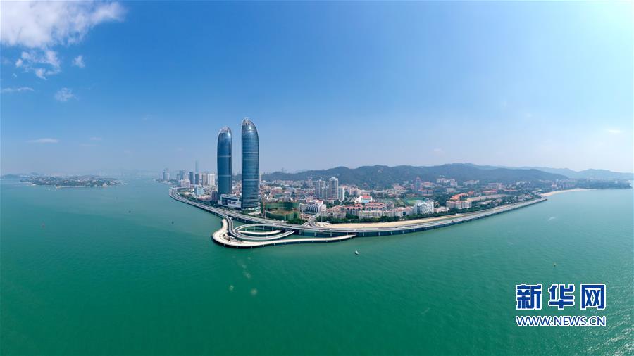 这是9月1日拍摄的福建省厦门市演武大桥沿线及鼓浪屿一带城市海滨风光(无人机全景照片)。新华社记者 姜克红 摄