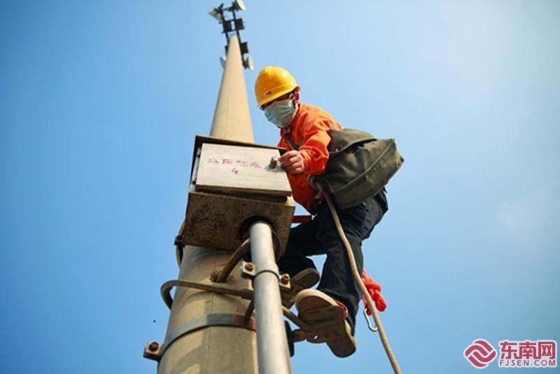 作业人员攀爬灯塔,关闭电源、锁闭配电箱准备作业。(林卫军 摄)