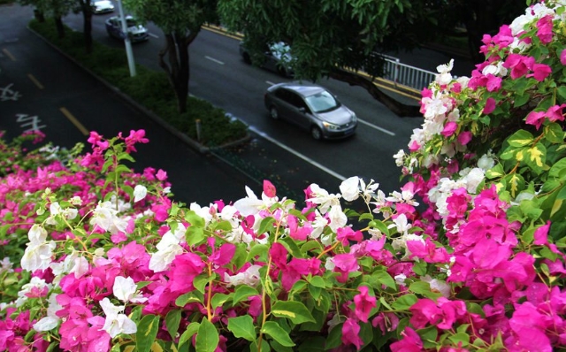 厦门湖滨南路湖滨中学天桥双色三角梅盛开。人民网 陈博 摄