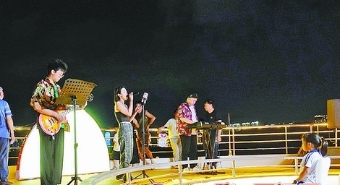 市民游客在游轮甲板欣赏乐队表演。(记者 汤海波 摄)