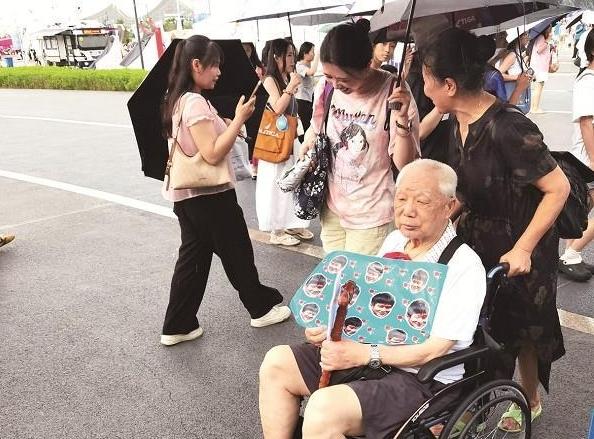 老人坐着轮椅冒雨来看球。