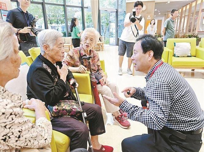参与活动的西安报业传媒集团(西安日报社)总编辑程建设在象屿慈爱老年养护中心与老人们交流。(全媒体记者 吴慧泉 摄)